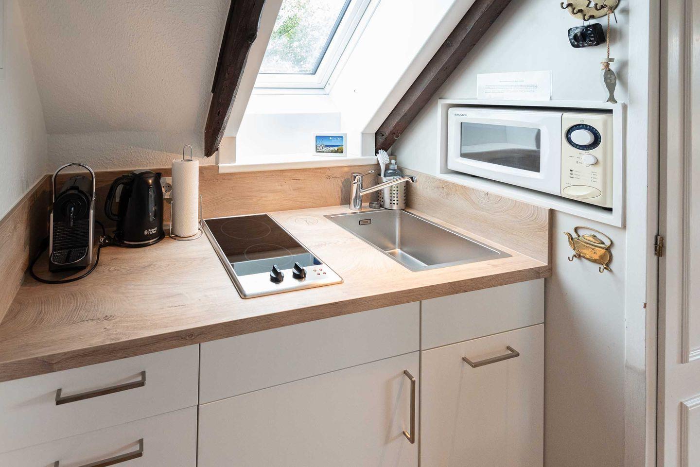 Küche: Im Eingangsbereich wurde unter dem Velux-Fenster geschickt eine kleine Pantry-Küche eingebaut, die gut ausgestattet ist und dank des 2-Plattenherdes und der Mikrowelle auch das Kochen im Urlaub ermöglicht.