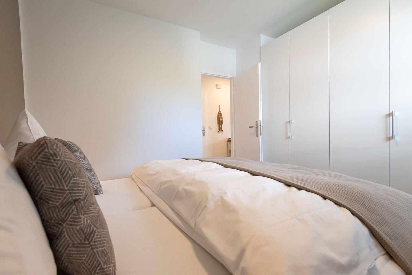 Schlafzimmer: Helles, modernes Doppelbettschlafzimmer mit Fenster und geräumigen Kleiderschrank.
