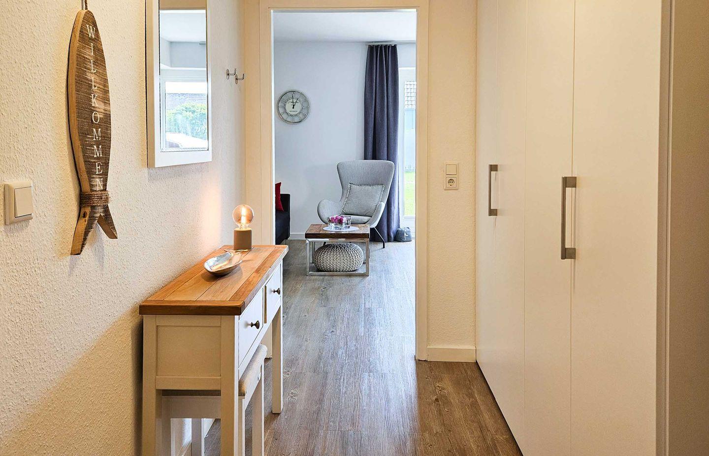 Eingangsbereich: Ein freundlich gestalteter Flur bietet genügend Stauraum für Garderobe und Schuhe.