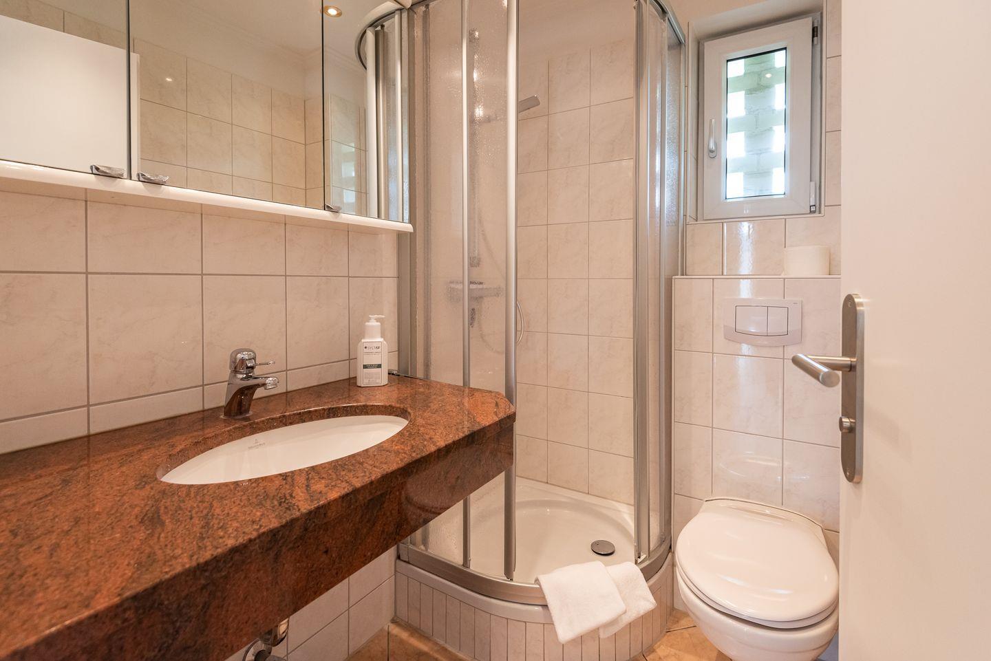 Badezimmer: Freundliches Badezimmer mit Dusche, WC und Fenster.