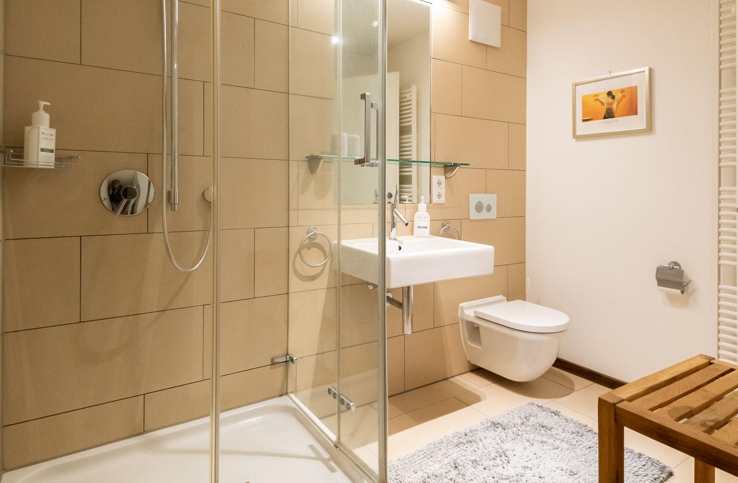 Badezimmer: Duschbad mit WC und Handtuchtrockner.