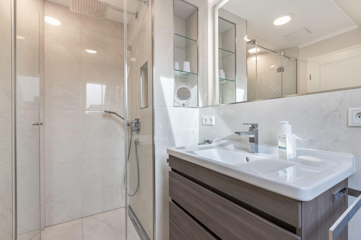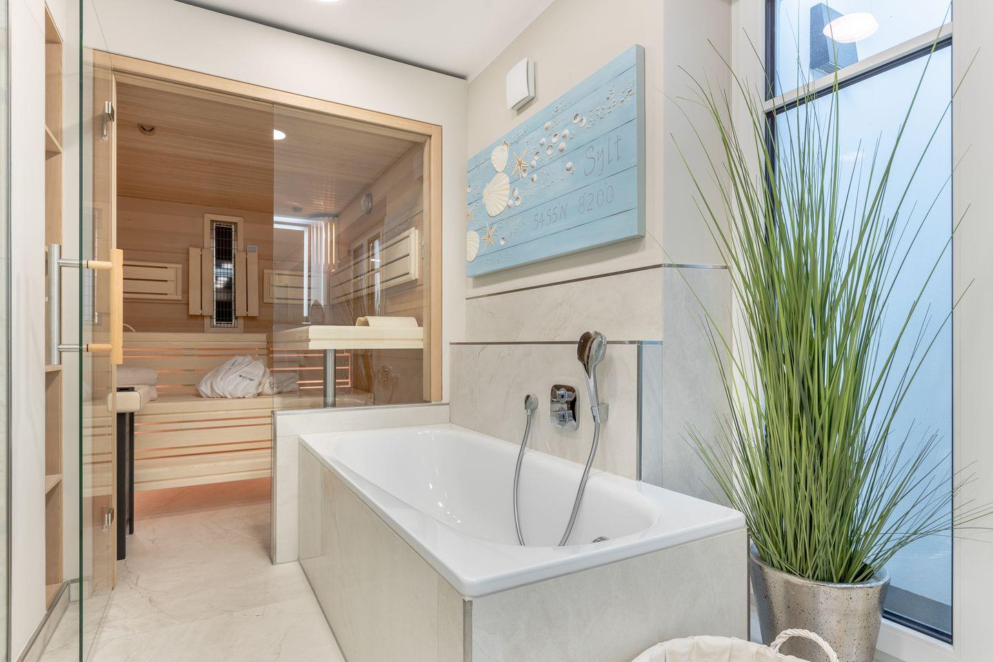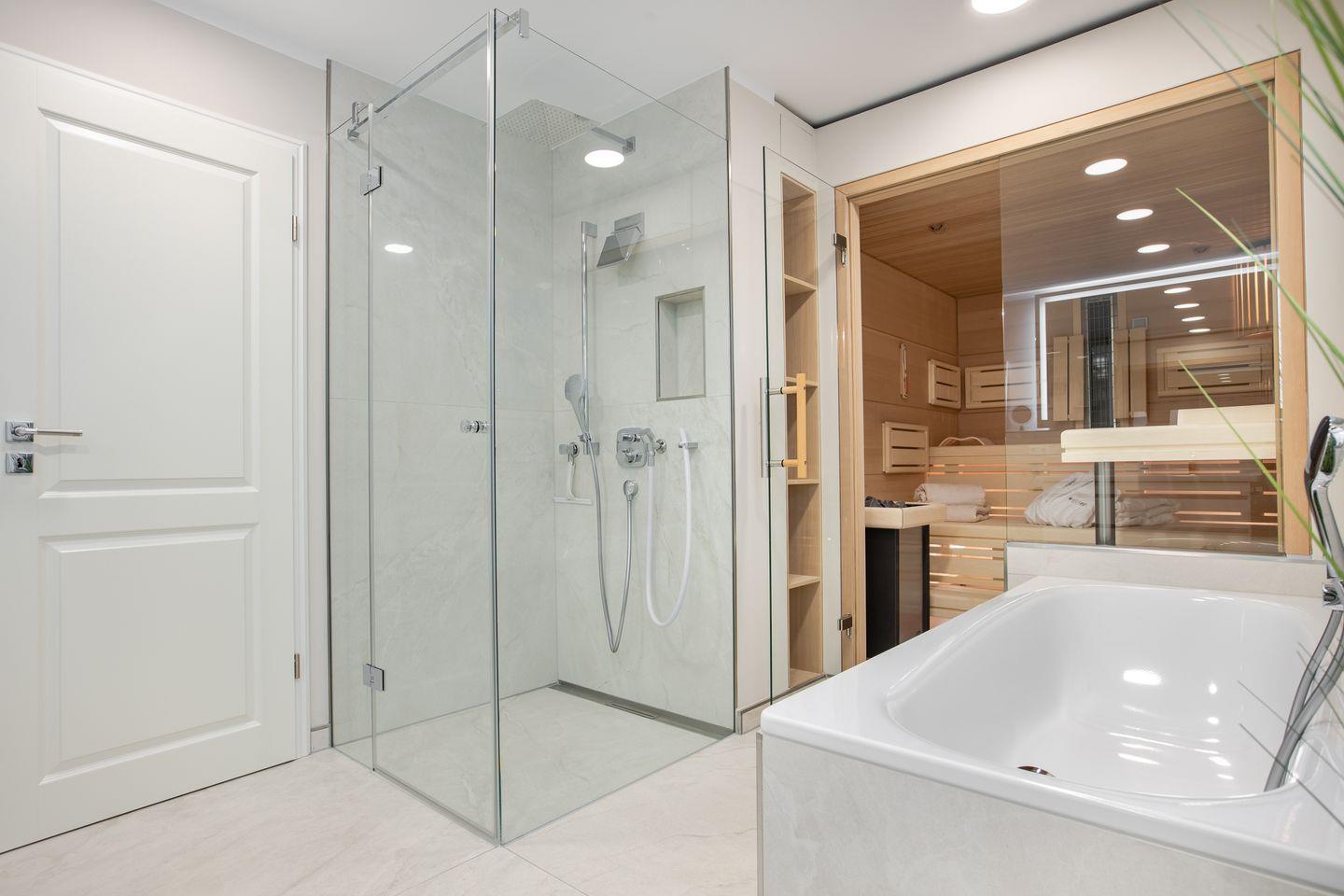 Ein modernes Vollbad mit Sauna und integriertem Infrarotsitzplatz.