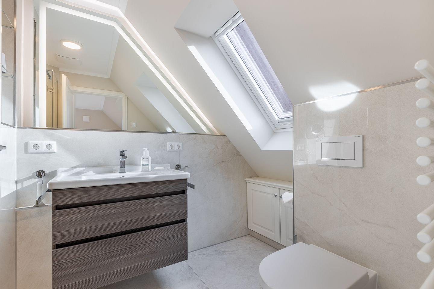 Zwei helle und bodengleiche Duschbäder mit Regenduschkopf, Handtuchtrockner und Fenster.