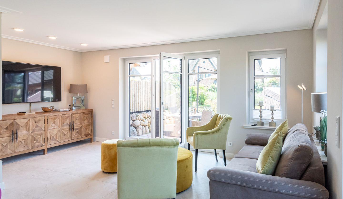 Vom Wohnbereich haben Sie Zugang zur sonnigen und ruhigen Südterrasse mit Gartenmöbeln, Saisonstrandkorb (April - Okt.) und Sonnenschirm.