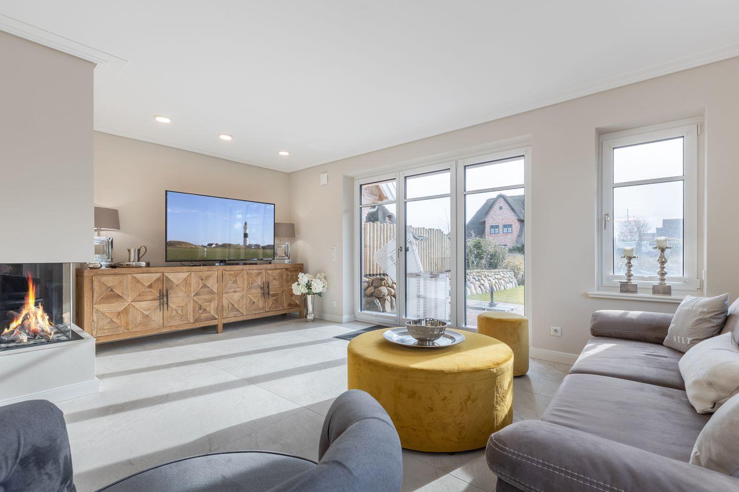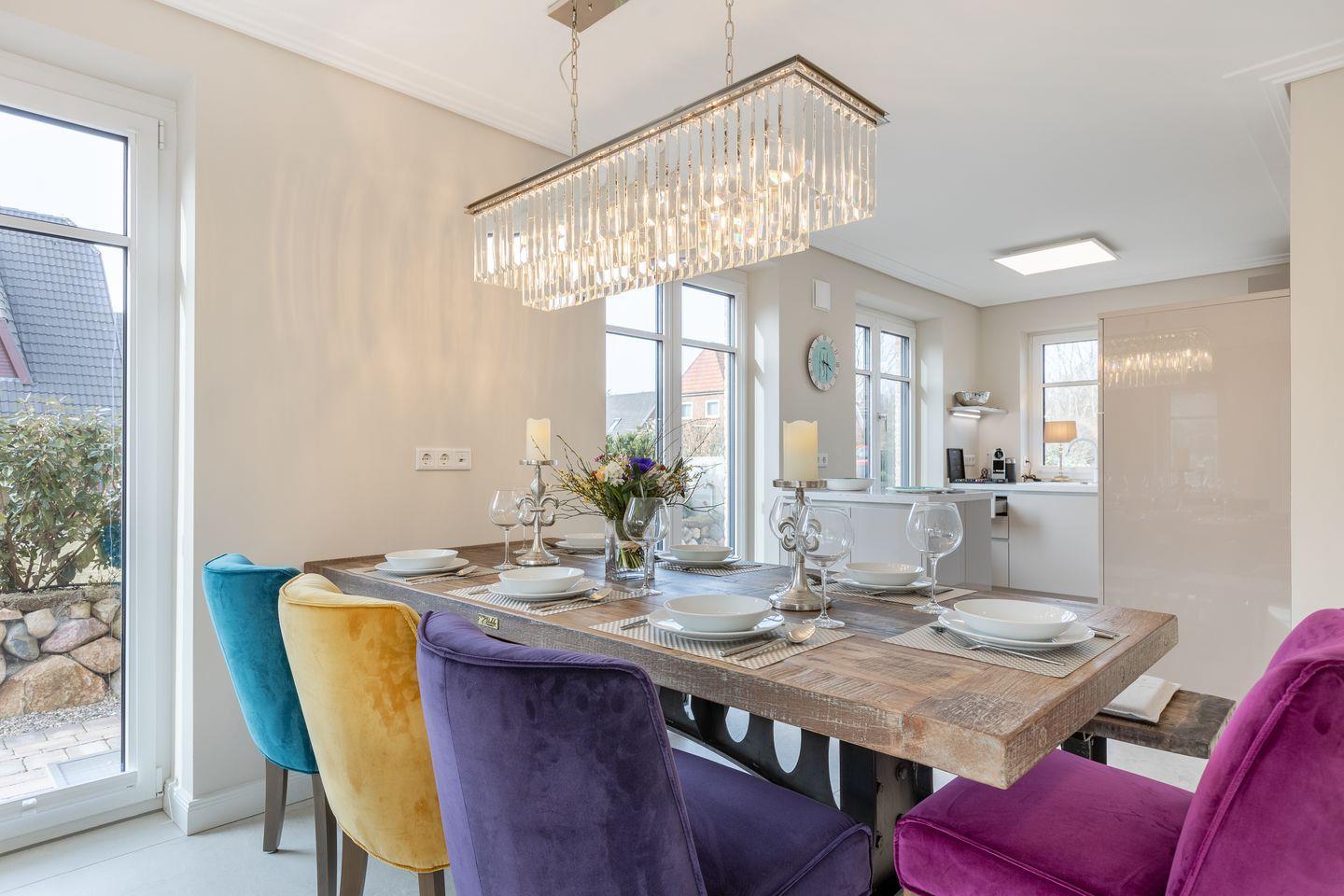 Über einen geräumigen Hausflur mit Garderobe gelangen Sie in den modernen Küchen- und Wohnbereich. Die helle und hochwertige, top ausgestattete, offene Küche lässt für Hobbyköche keine Wünsche offen. Der Esstisch bietet mit besonderer Bestuhlung Platz für bis zu 7 Personen und grenzt die Küche perfekt vom Wohnbereich ab. Der Wohnbereich überzeugt mit seiner bequemen Sitzgruppe, großem TV, Gaskamin und Blick in den Garten.