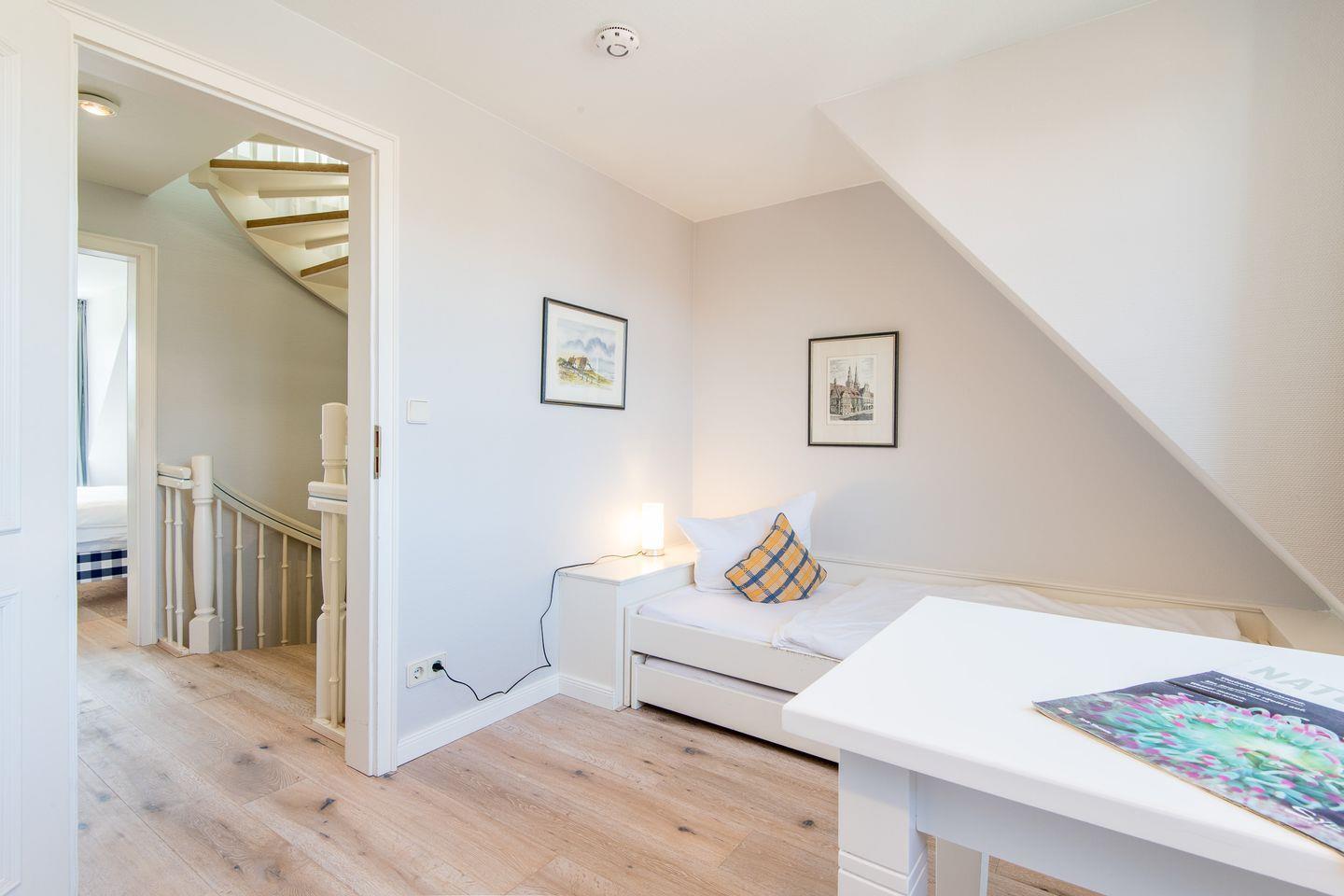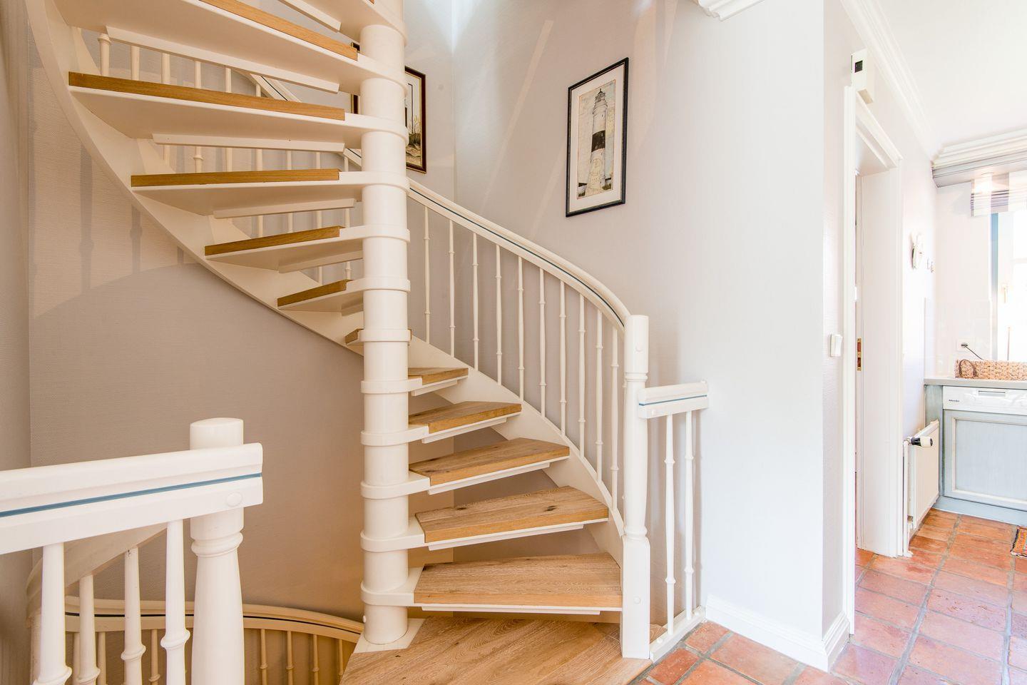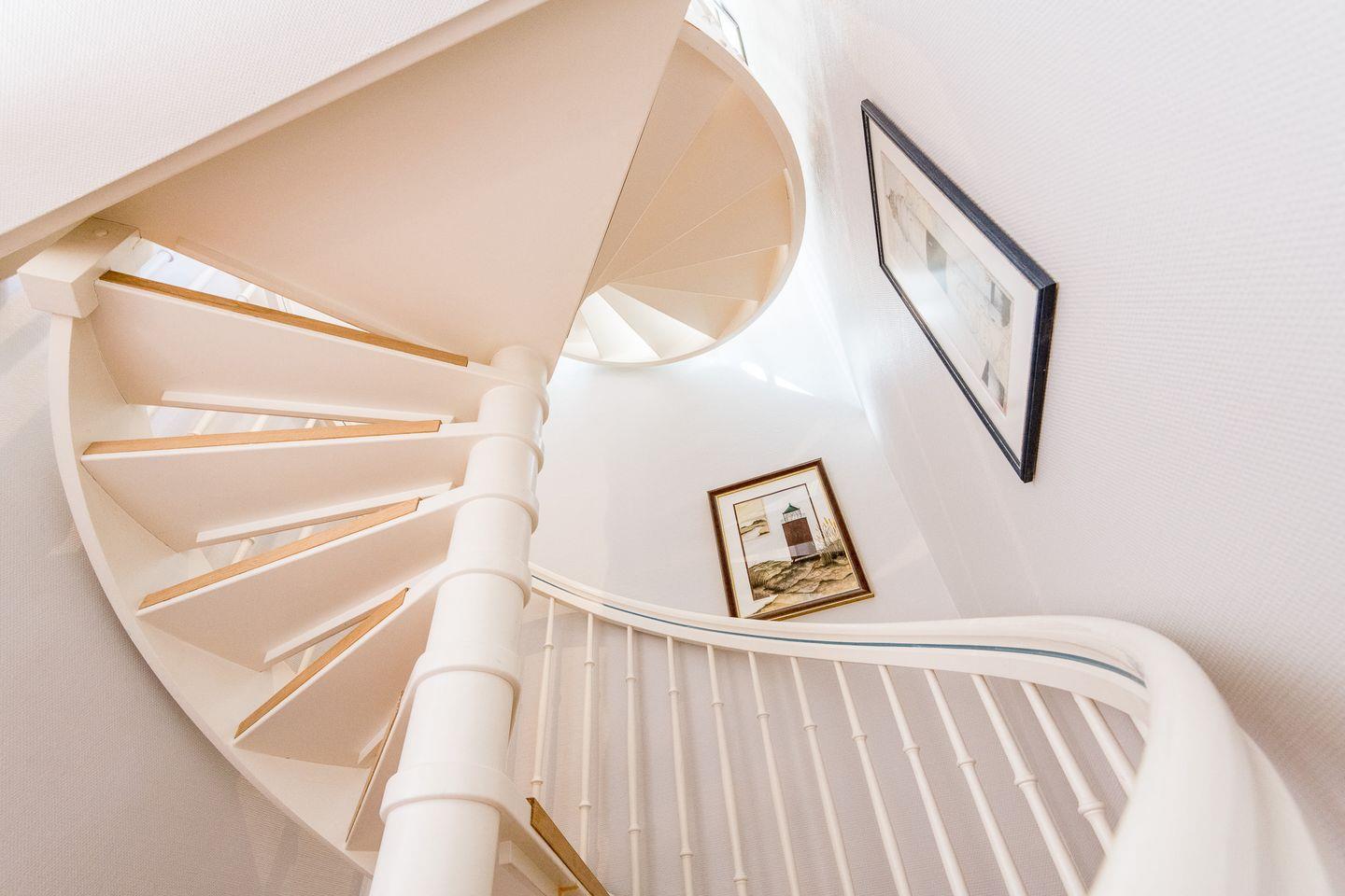 Über eine Wendeltreppe gelangen Sie in das Obergeschoss: