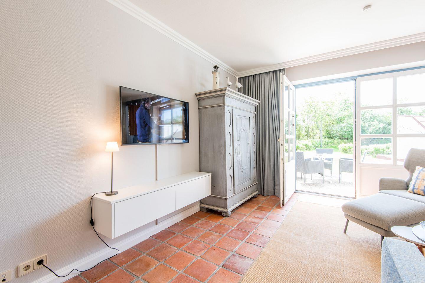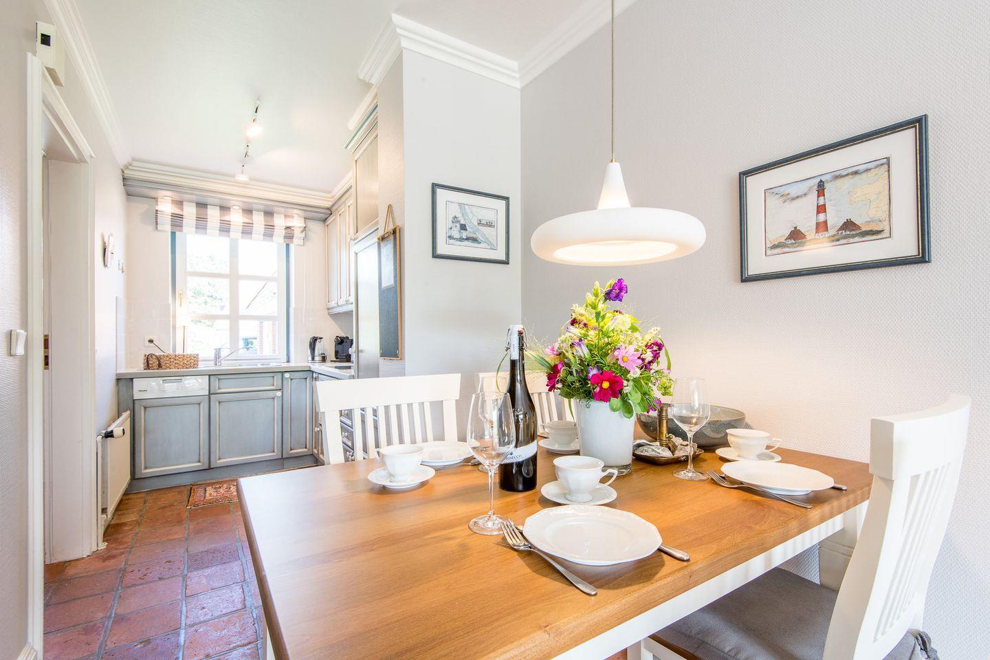 Wohn-/Koch-/Essbereich: Gut ausgestattete Landhausküchenzeile mit angrenzendem Essenbereich mit Platz für bis zu 4 Personen. Der gemütliche Wohnbereich lädt mit TV, Sofaecke und Sessel zum Verweilen ein. Vom Wohnbereich haben Sie Zutritt auf die möblierte Südterrasse mit eigenem Strandkorb.
