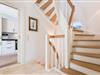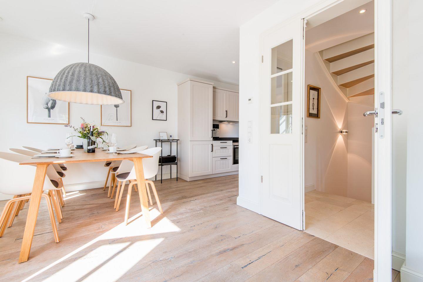 Vom großzügigen Flur führt eine Treppe in das helle und exklusiv eingerichtete Obergeschoss mit hohen Decken: