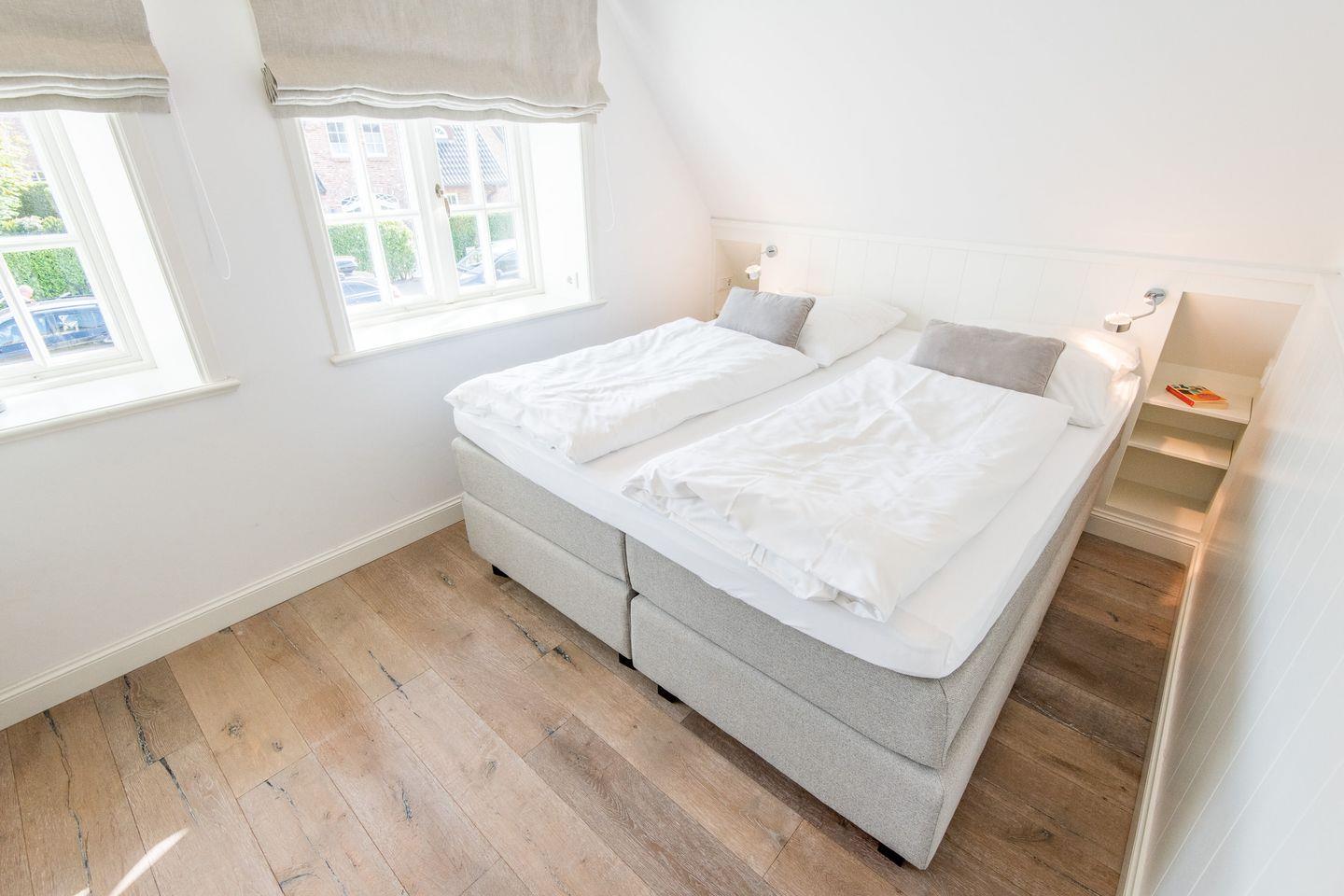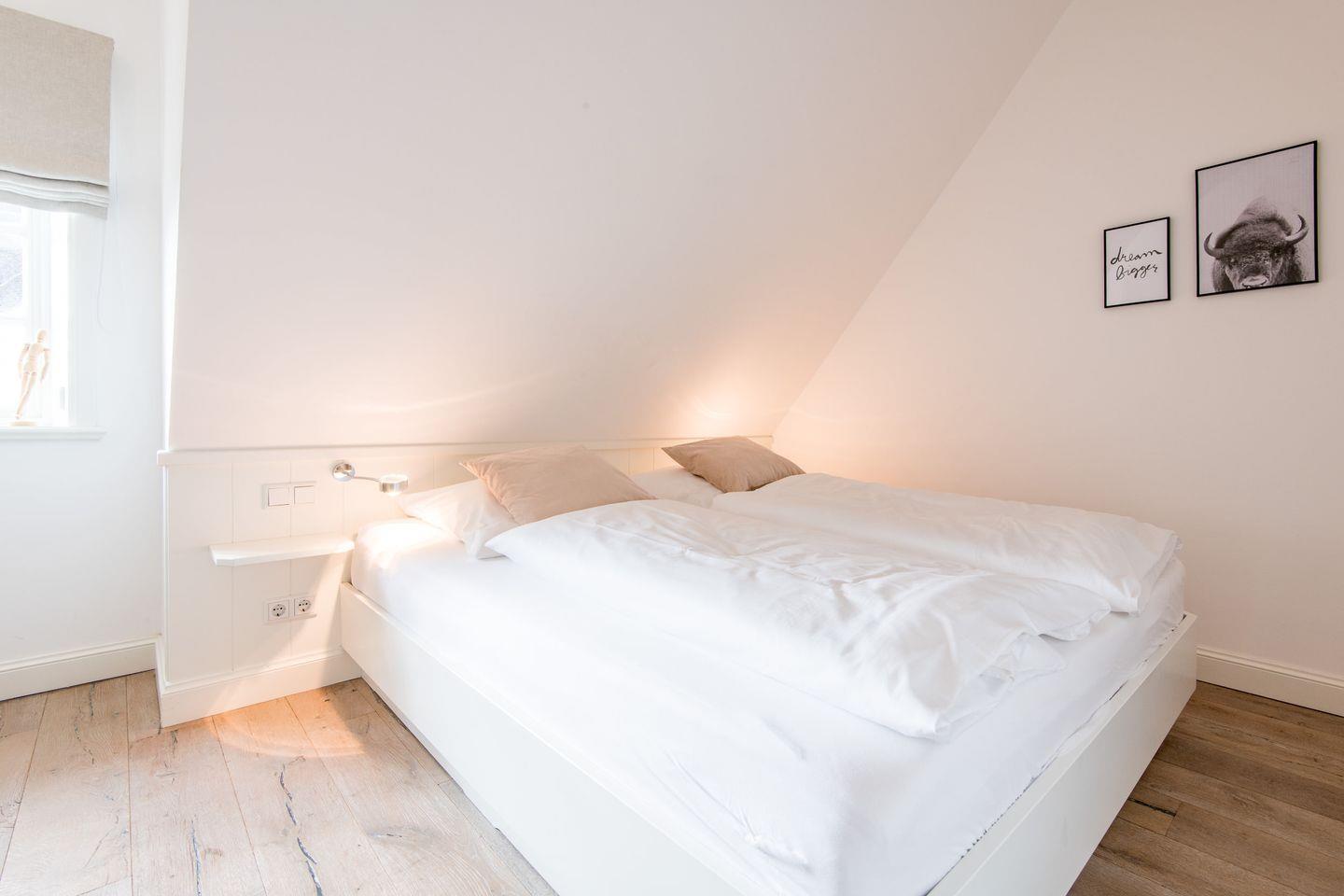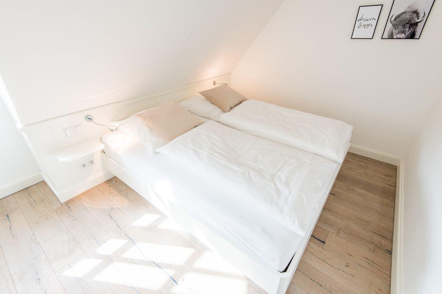 Schlafzimmer 2: Doppelbett (1,80 x 2,0 m), Einbauschränke, TV und kleinem Schreibtisch sowie Fenster nach Westen.