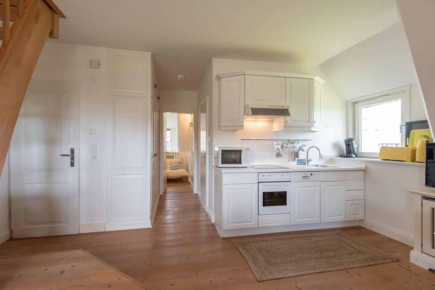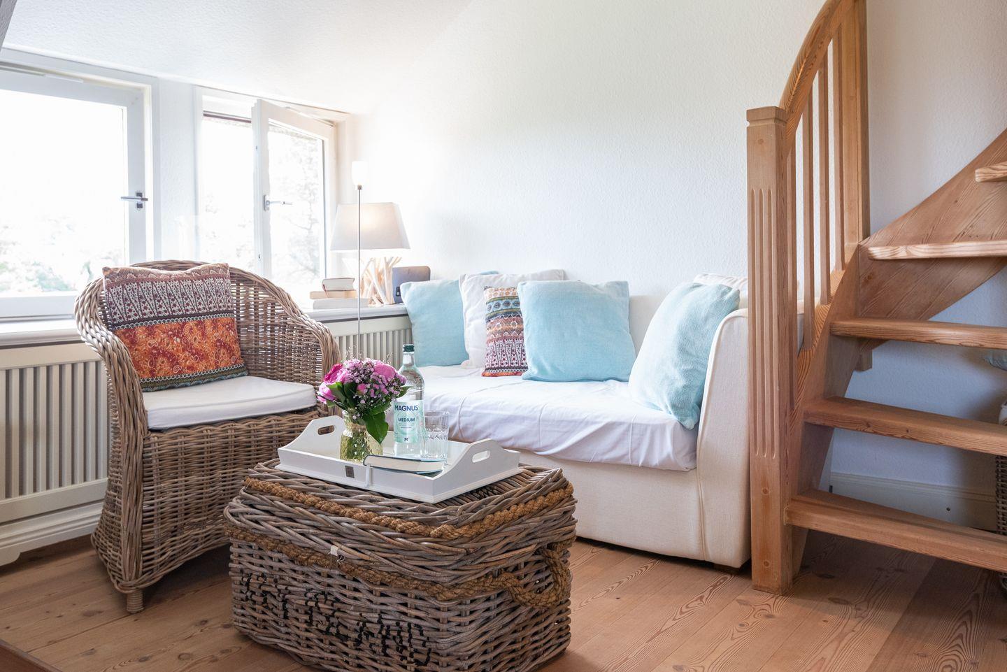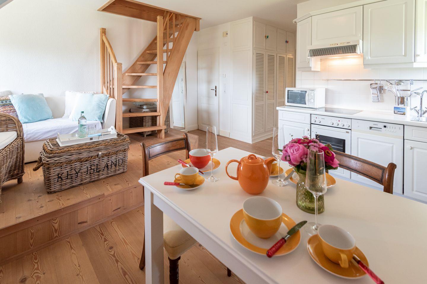Wohn-/Koch-/Essbereich: Der Wohnbereich überzeugt mit seiner gemütlichen Sofaecke, welche zum Verweilen einlädt. Genießen Sie den hervorragenden Blick auf das Wattenmeer und die Braderuper Heide. Die helle Küchenzeile im Landhausstil ist perfekt ausgestattet und grenzt direkt an den Essbereich für 4 Personen. Von hier haben Sie einen ausgezeichneten Blick auf den Kampener Leuchtturm. Zur Wohnung gehört eine möblierte Sonnenkuhle mit Strandkorb und Gartenmöbeln. Diese befindet sich links vorm Hauseingang (unter dem Küchenfenster).