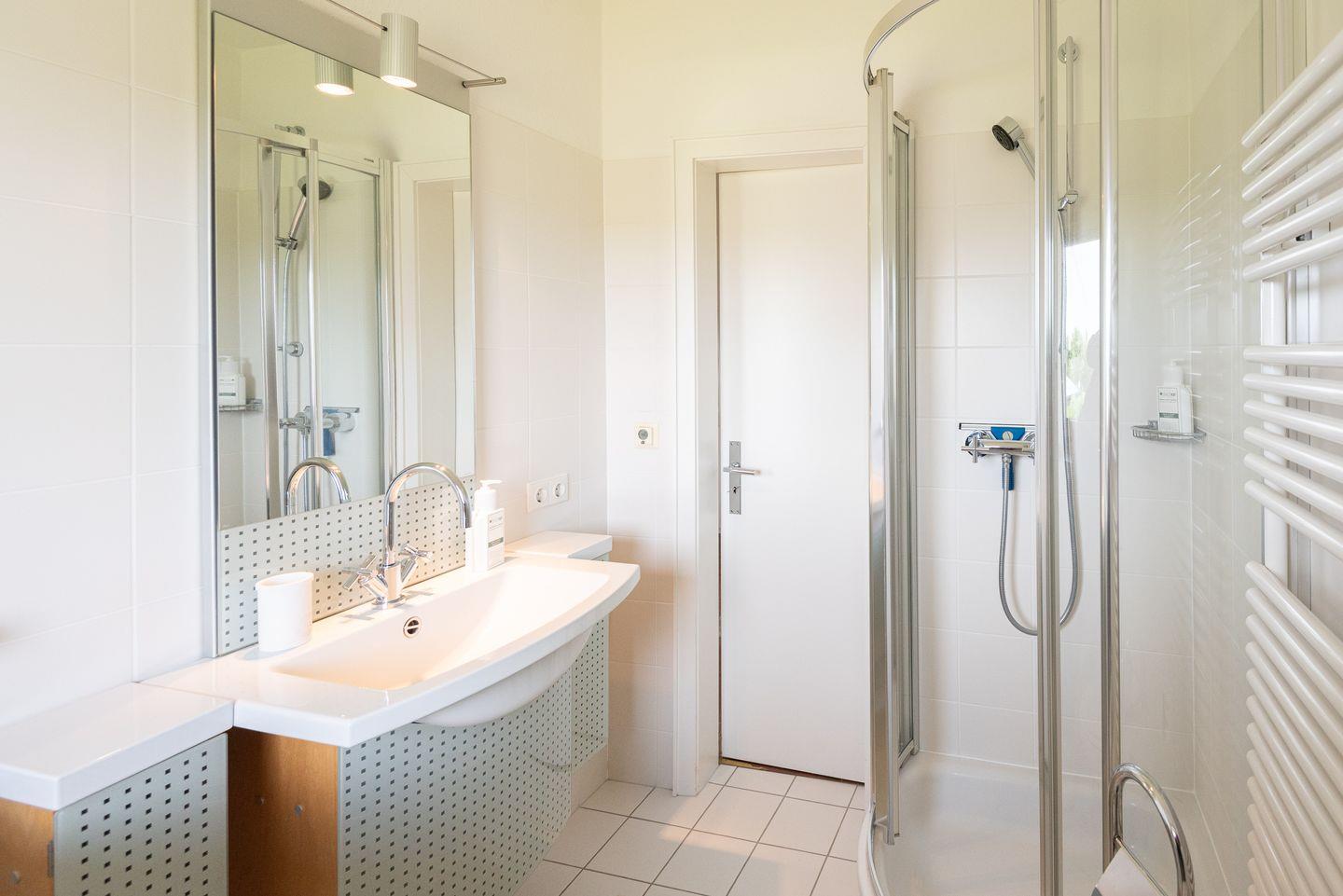 Badezimmer: Helles Duschbad mit Fenster und Fußbodenheizung.
