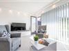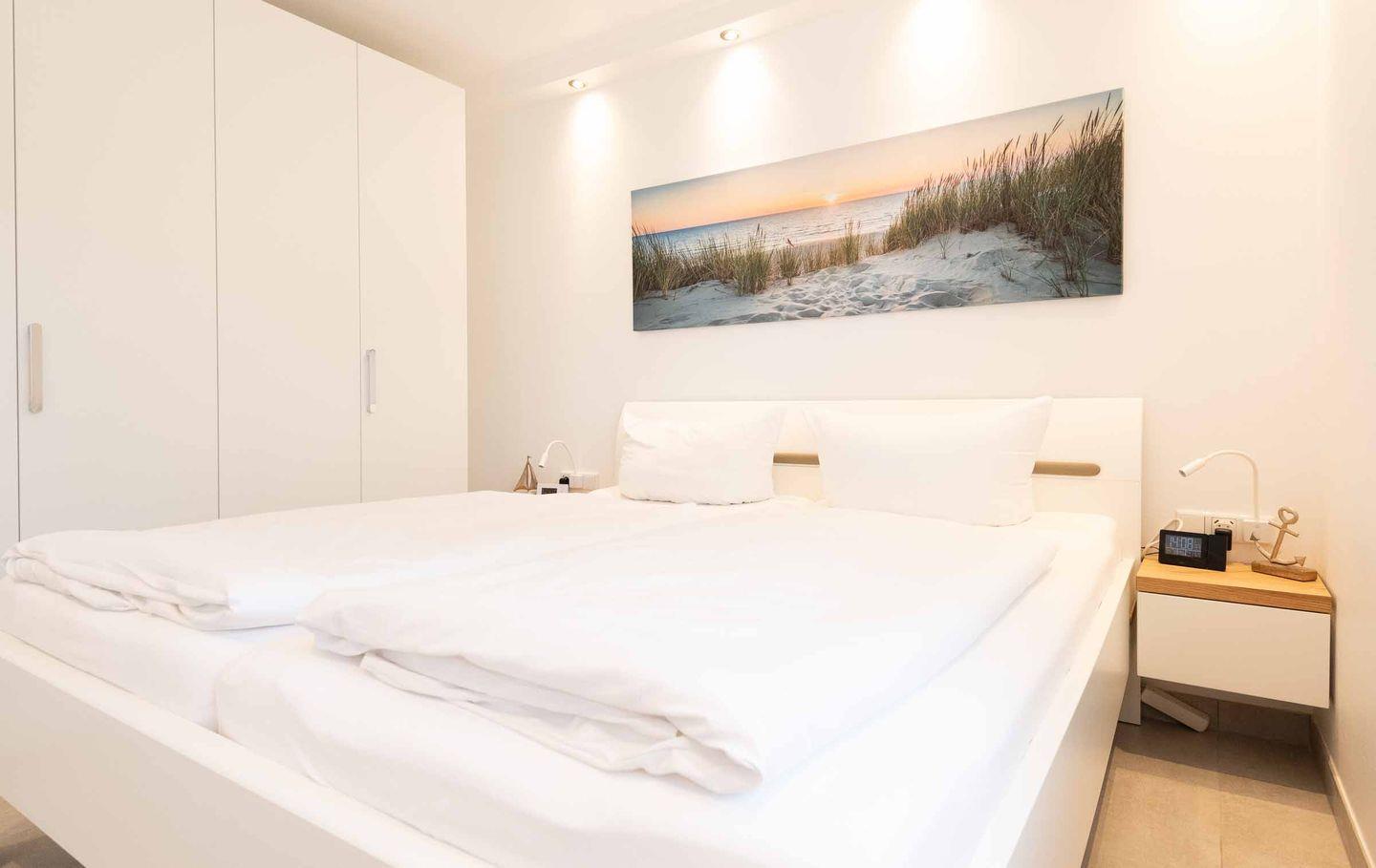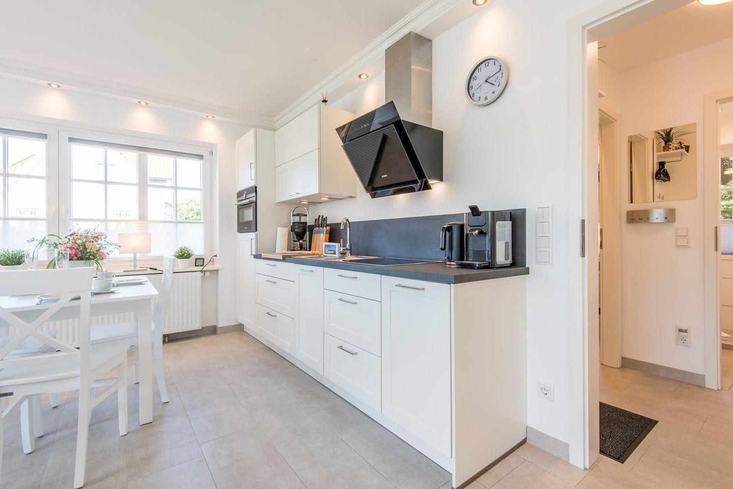 Koch-/Wohn-/Essbereich: Neben der modernen und gut ausgestatteten Küchenzeile befindet sich der Esstisch für 3 Personen. Eine komfortable Sofaecke mit hochwertiger Schlafcouch (1,60 x 2,00 m) inkl. TV runden den Wohnbereich ab. Die großen Fenster und der Ausgang auf die eigene möblierte West-Terrasse mit Saison-Strandkorb laden zum Urlaub machen ein.