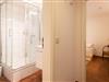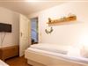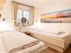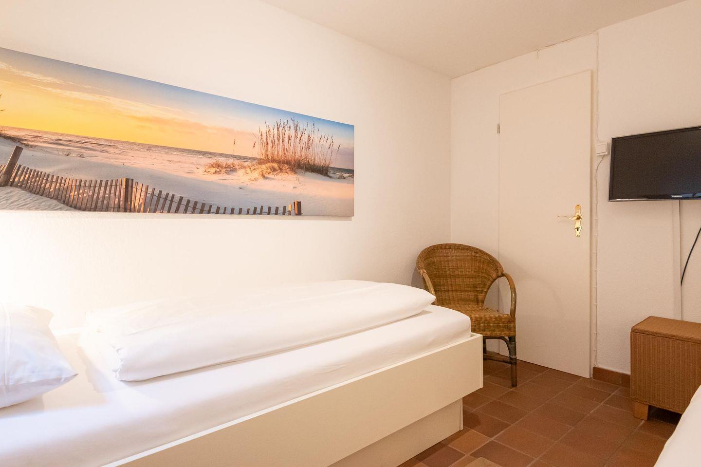 Schlafzimmer 2: 2 Einzelbetten, begehbarer Kleiderschrank, TV und Fenster.