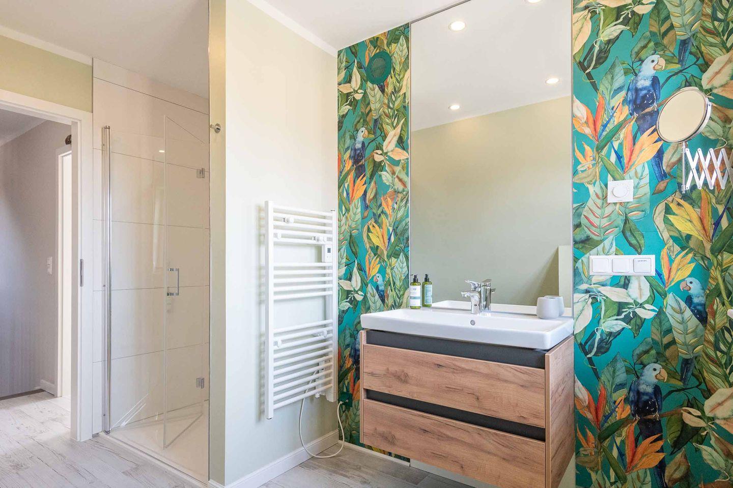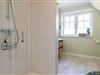 Badezimmer 2 & Sauna: Großzügiges maritimes Badezimmer mit bodengleicher Regendusche, Handtuchtrockner, Fenster und großer Sauna zur Eigennutzung.