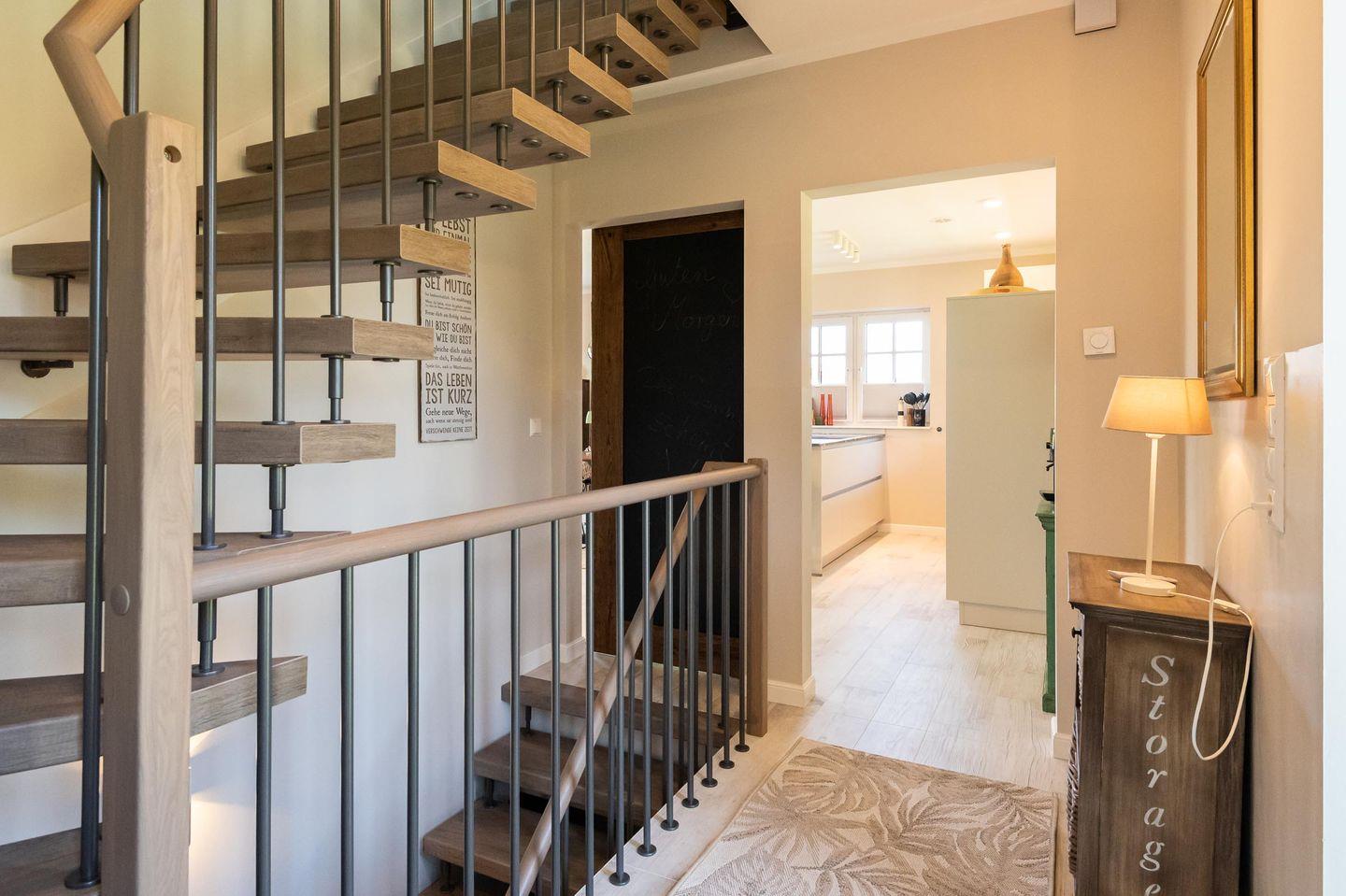 Das Treppenhaus zum großzügigen Untergeschoss/Warftgeschoss wird durch eine Schiebetür vom Wohnraum abgetrennt, hier erwartet Sie: