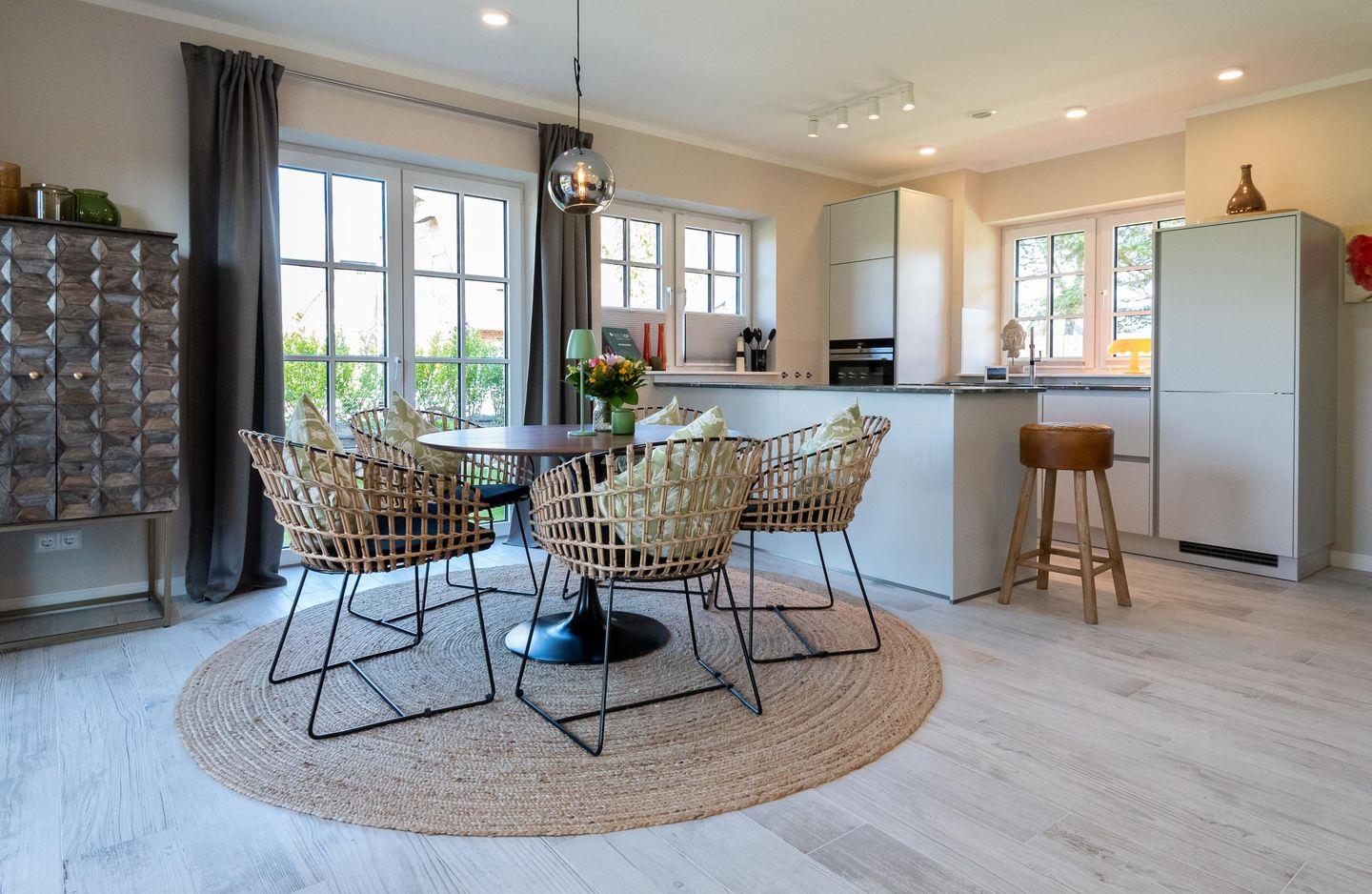 Im Erdgeschoss gelangen Sie über einen offenen Flur in den lichtdurchfluteten Wohn-/Essbereich mit offener Küche: