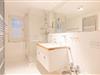 Badezimmer: Helles und modernes Bad mit Fußbodenheizung, bodentiefer Dusche, Handtuchtrockner und Fenster.
