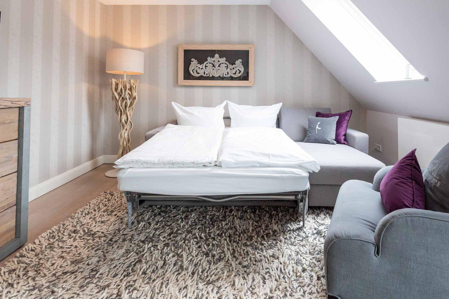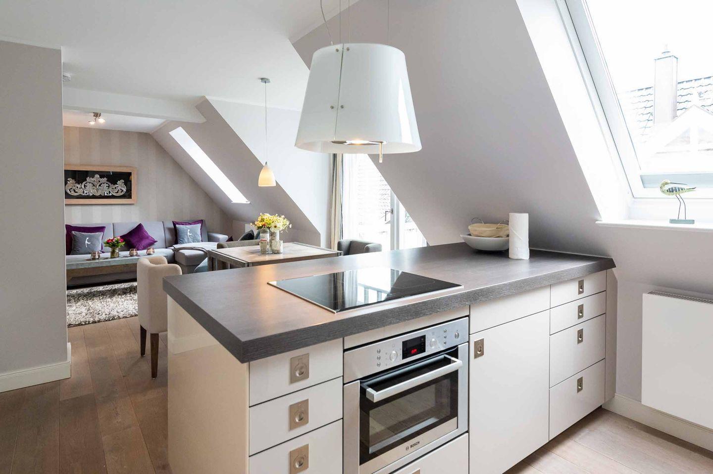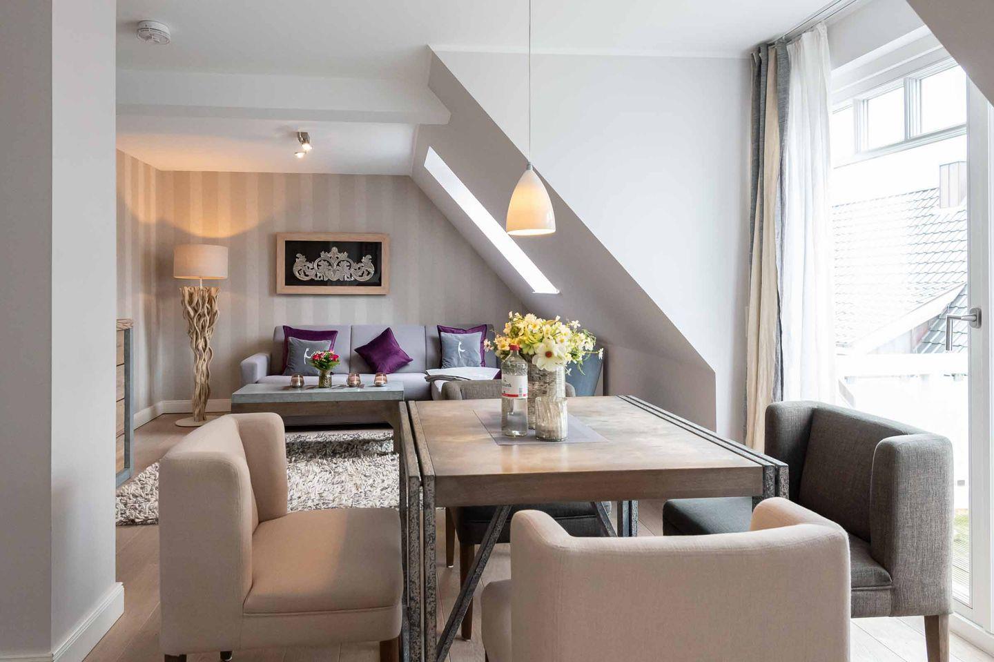 Die offene Küche mit Dachfenster ist sehr gut ausgestattet und verfügt über hochwertige Küchengeräte. Der moderne und helle Essbereich lädt zu geselligen Mahlzeiten ein und geht über in den stilvoll eingerichteten Wohnraum mit einer gemütlichen Sofaecke mit Sessel und TV. Bei dem Sofa handelt es sich um eine hochwertige Doppelschlafcouch, die einen Schlafplatz für eine dritte Person bietet.