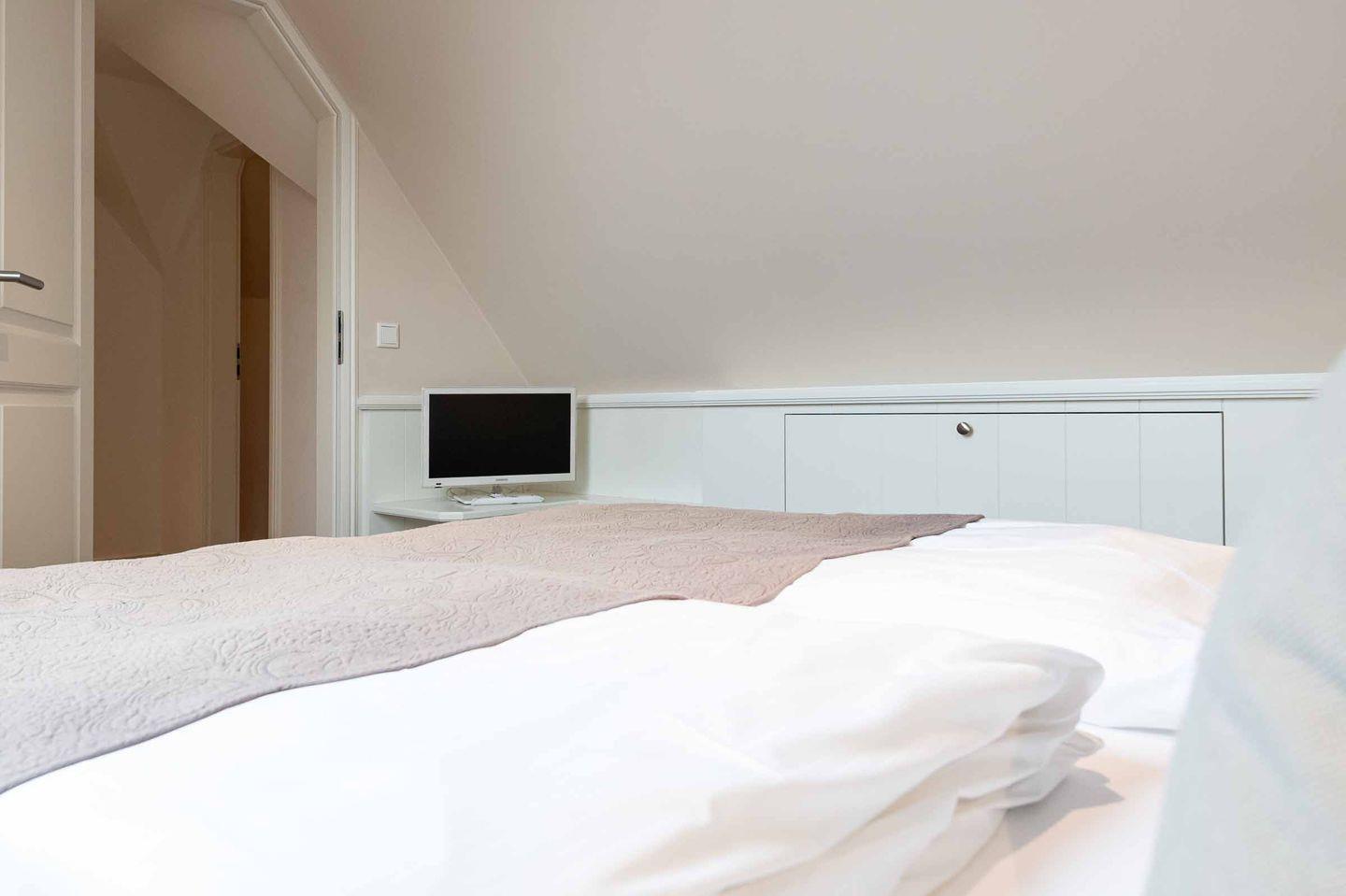Ein Schlafzimmer mit Doppelbett, Einbauschränken, TV und Fenster.