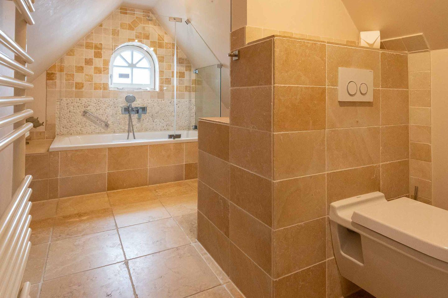 Helles Bad mit Fußbodenheizung, Badewanne mit Duschtrennwand und Duschkopfhalterung, WC, Handtuchtrockner und Fenster.
