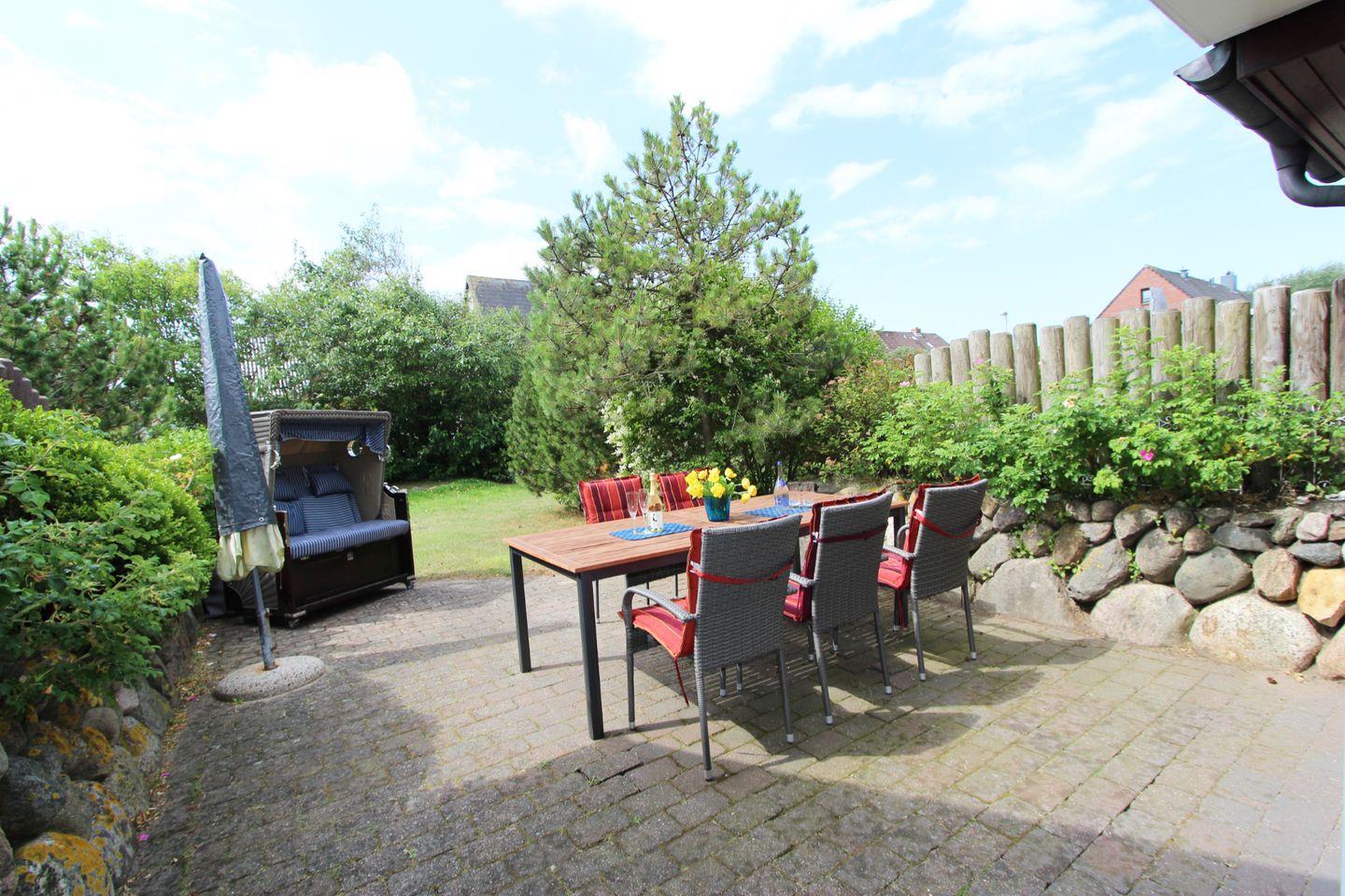 Vom Wohnbereich aus geht es in den Garten auf die große Sonnenterrasse mit Strandkorb und komfortablen Gartenmöbeln. Der Strandkorb lädt im schön angelegten Garten mit Süd-Lage zum Verweilen ein.