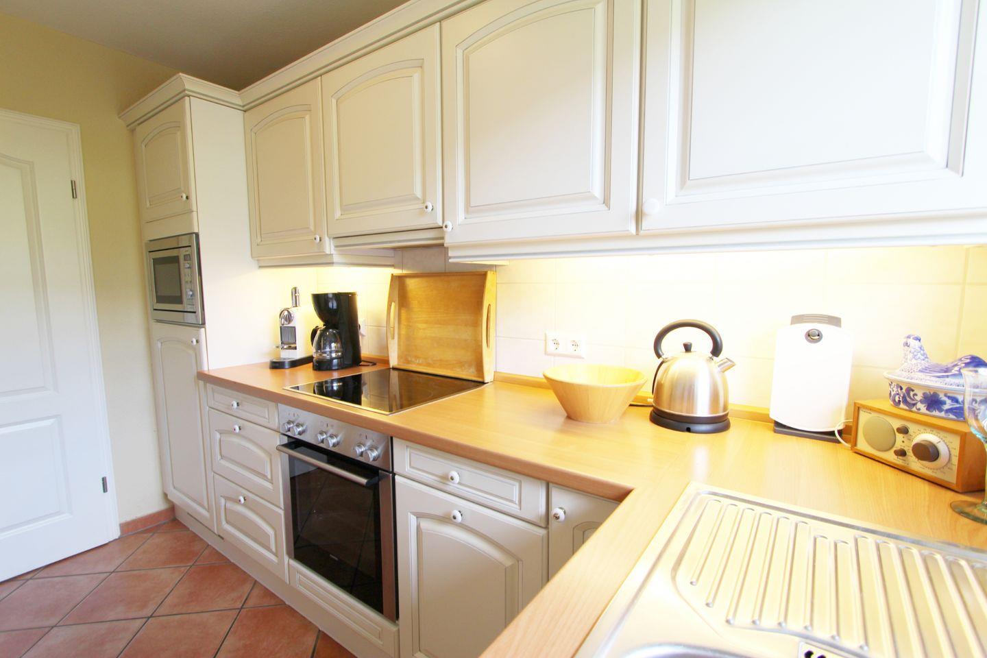 In der separaten, hochwertig ausgestatteten Küche können Sie nach Herzenslust kochen. Der großzügige Essensplatz im Wohnbereich lädt zu entspannten Mahlzeiten ein.