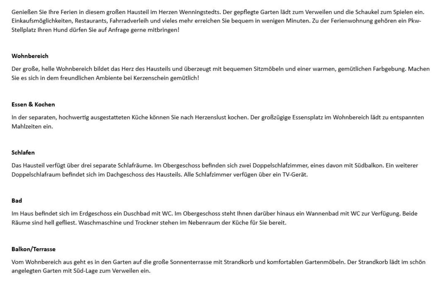 Genießen Sie Ihre Ferien in diesem großen Hausteil im Herzen Wenningstedts. Der gepflegte Garten lädt zum Verweilen und die Schaukel zum Spielen ein. Einkaufsmöglichkeiten, Restaurants, Fahrradverleih und vieles mehr erreichen Sie bequem in wenigen Minuten. Zu der Ferienwohnung gehören ein Pkw-Stellplatz Ihren Hund dürfen Sie auf Anfrage gerne mitbringen!