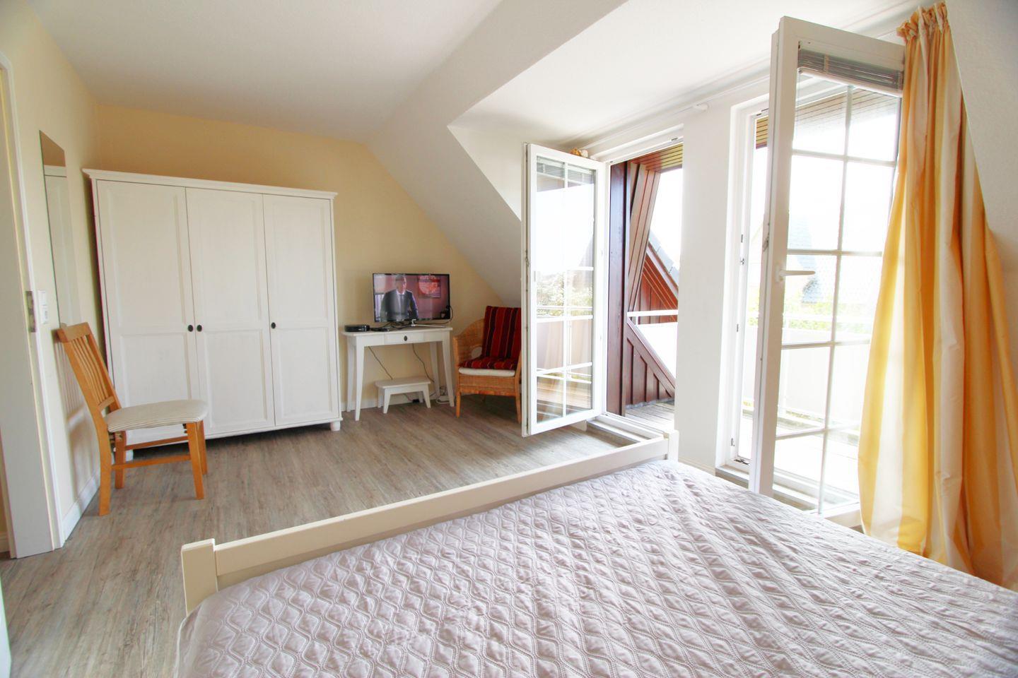 Das Hausteil verfügt über drei separate Schlafräume. Im Obergeschoss befinden sich zwei Doppelschlafzimmer, eines davon mit Südbalkon. Ein weiterer Doppelschlafraum befindet sich im Dachgeschoss des Hausteils. Alle Schlafzimmer verfügen über ein TV-Gerät.