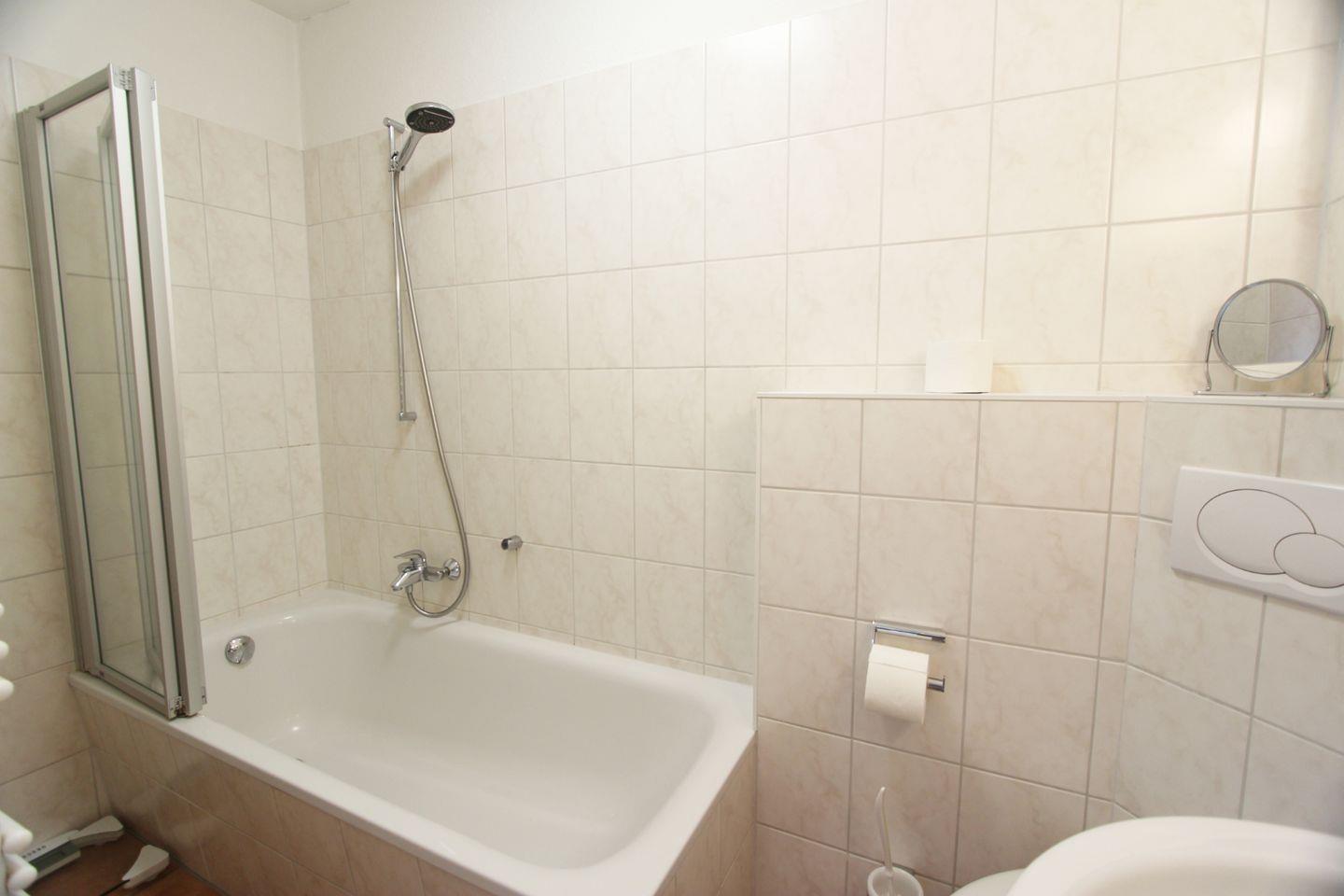 Im Haus befindet sich im Erdgeschoss ein Duschbad mit WC. Im Obergeschoss steht Ihnen darüber hinaus ein Wannenbad mit WC zur Verfügung. Beide Räume sind hell gefliest. Waschmaschine und Trockner stehen im Nebenraum der Küche für Sie bereit.