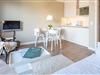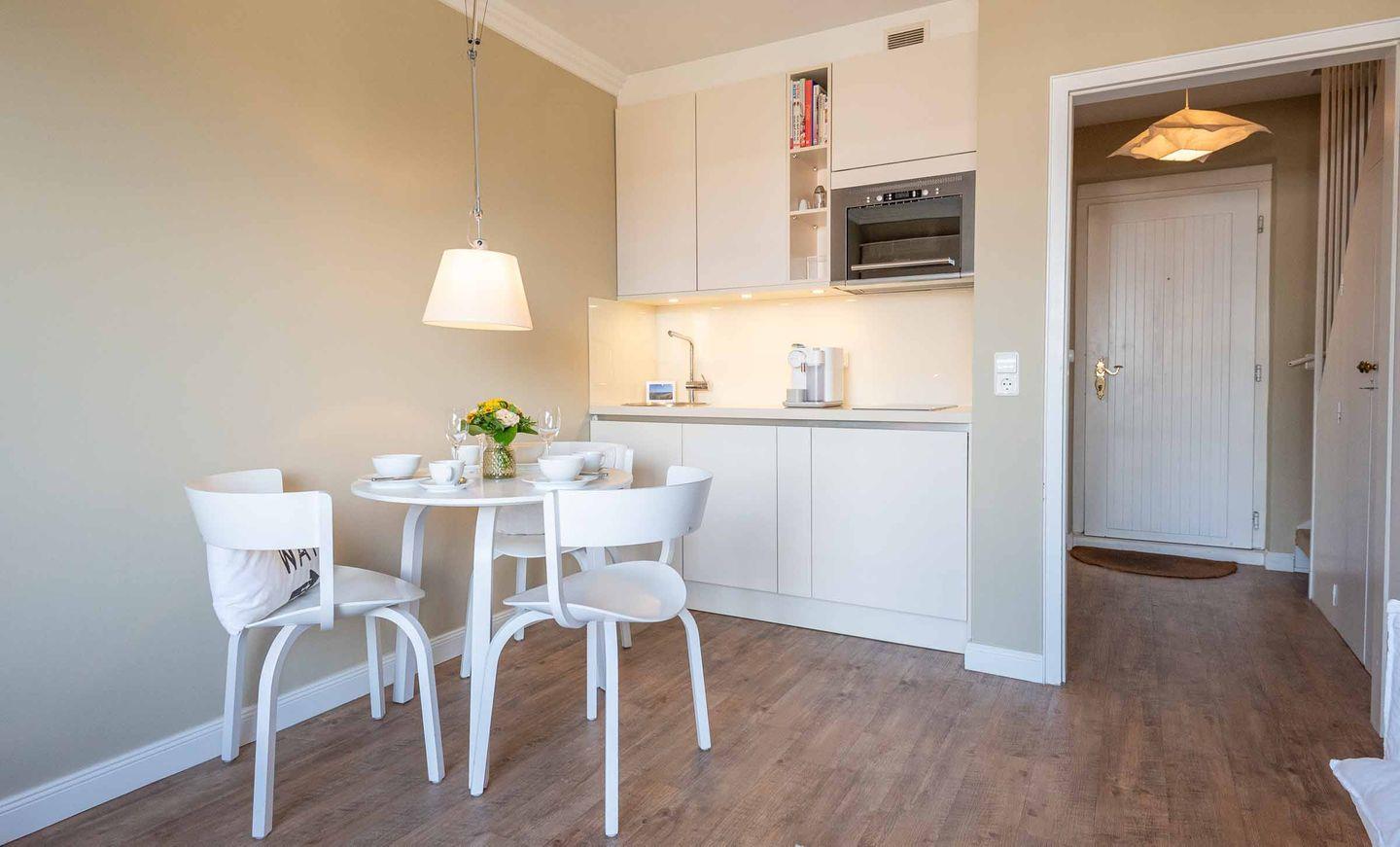 Im lichtdurchfluteten Obergeschoss befindet sich neben einem kleinen Eingangsbereich die offene und gut ausgestattete Küchenzeile, die direkt an einen komfortablen Wohn- und Essbereich angrenzt: Hier erwartet Sie neben einem bequemen Sofa mit Sessel und TV der einladende Essbereich.