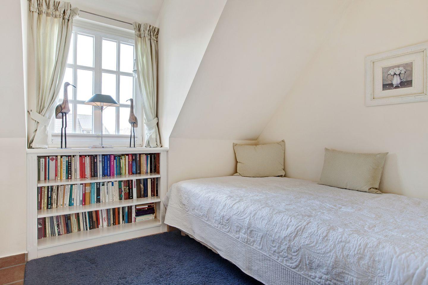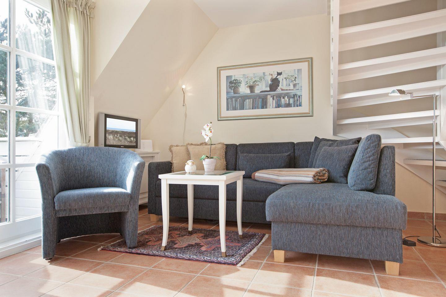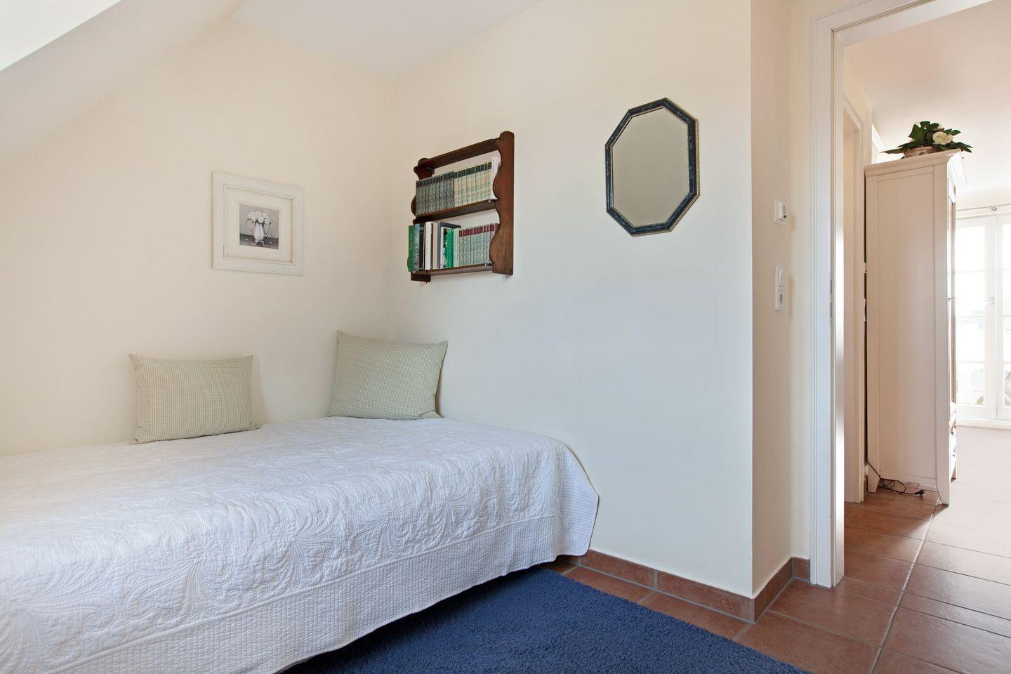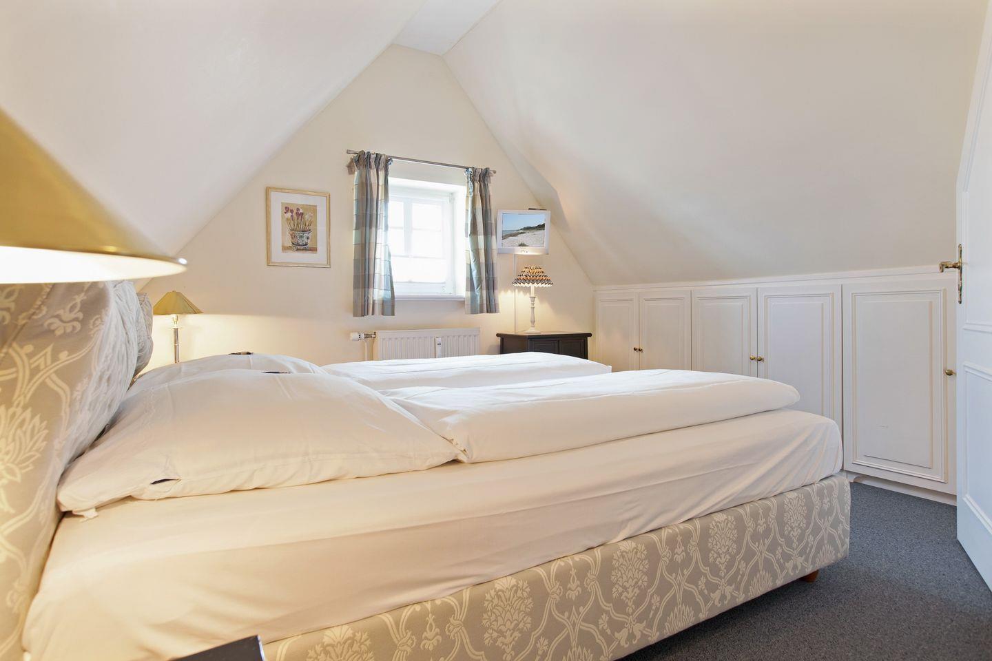 Über die Treppe erreichen Sie das Dachgeschoss mit einem gemütlichen Doppelbett. Die Wohnung ist mit ihrer Lage der perfekte Ausgangspunkt für eine Entdeckungsreise über die Insel Sylt – Sie erreichen in wenigen Autominuten die Orte Westerland oder Kampen und auch durch die öffentlichen Verkehrsmittel finden Sie hier jederzeit eine gute Anbindung.