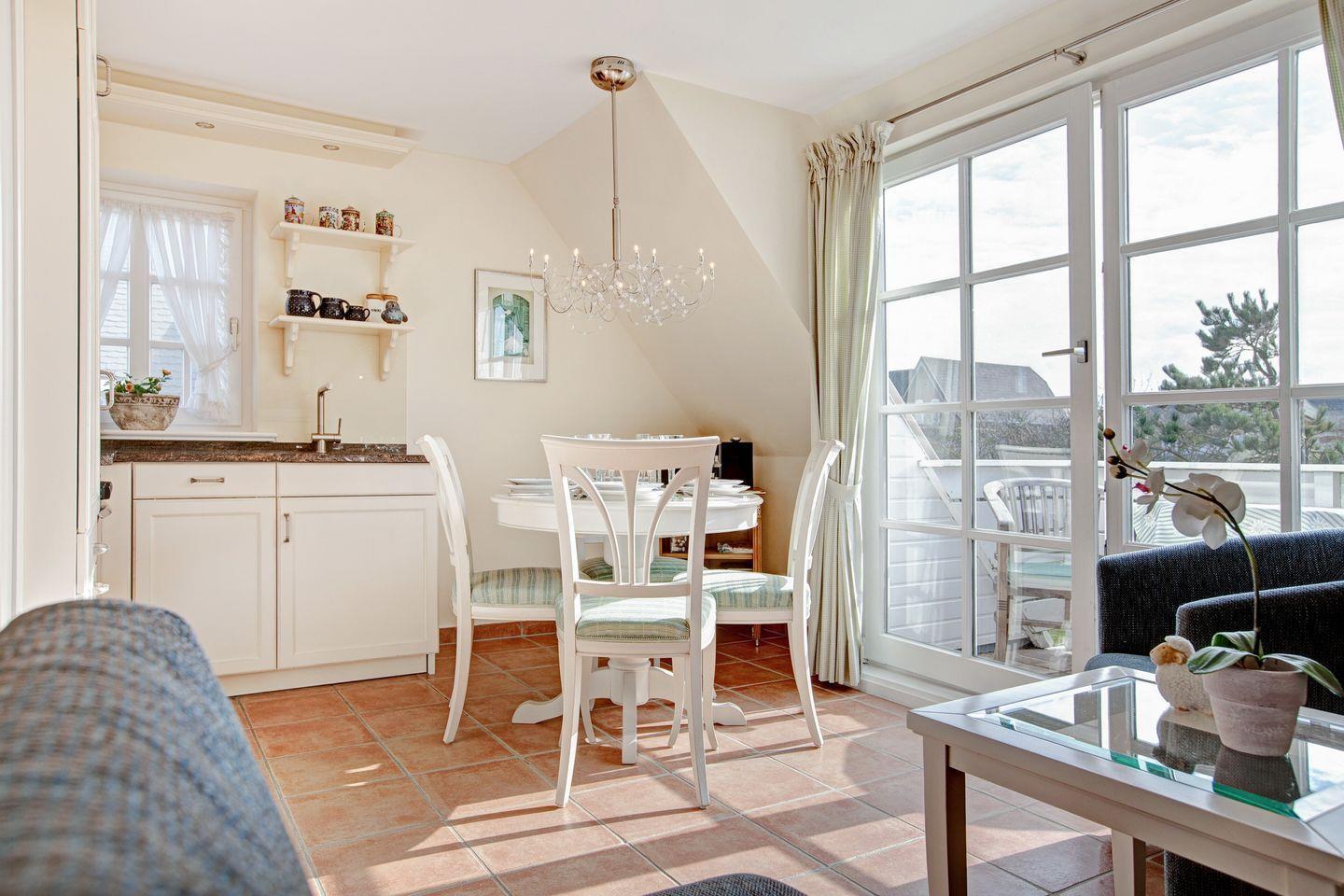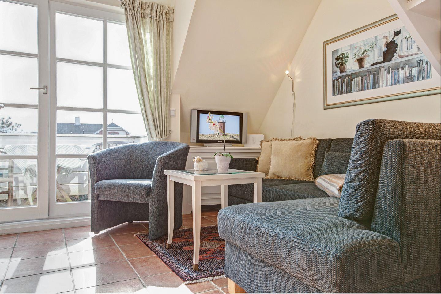Dieses lichtdurchflutete Feriendomizil befindet sich im Herzen von Wenningstedt und überzeugt mit einer charmanten, friesisch-angehauchten Einrichtung. In der Wohnung finden Sie einen großzügigen Wohnraum mit einer Sofaecke, Esstisch und einer Küchenzeile.