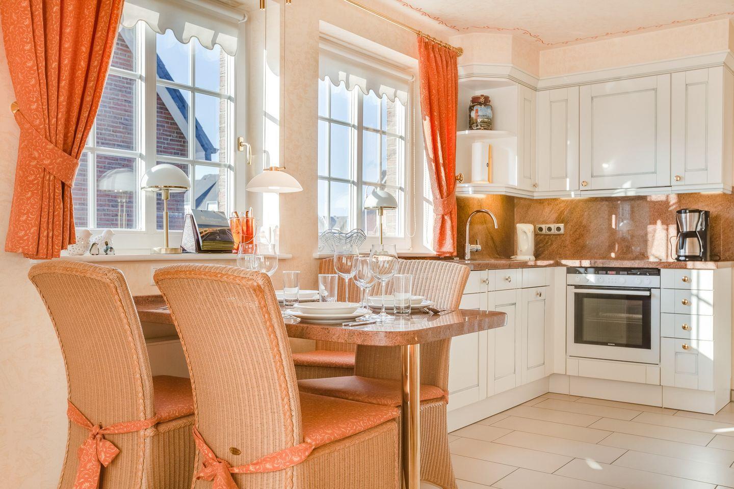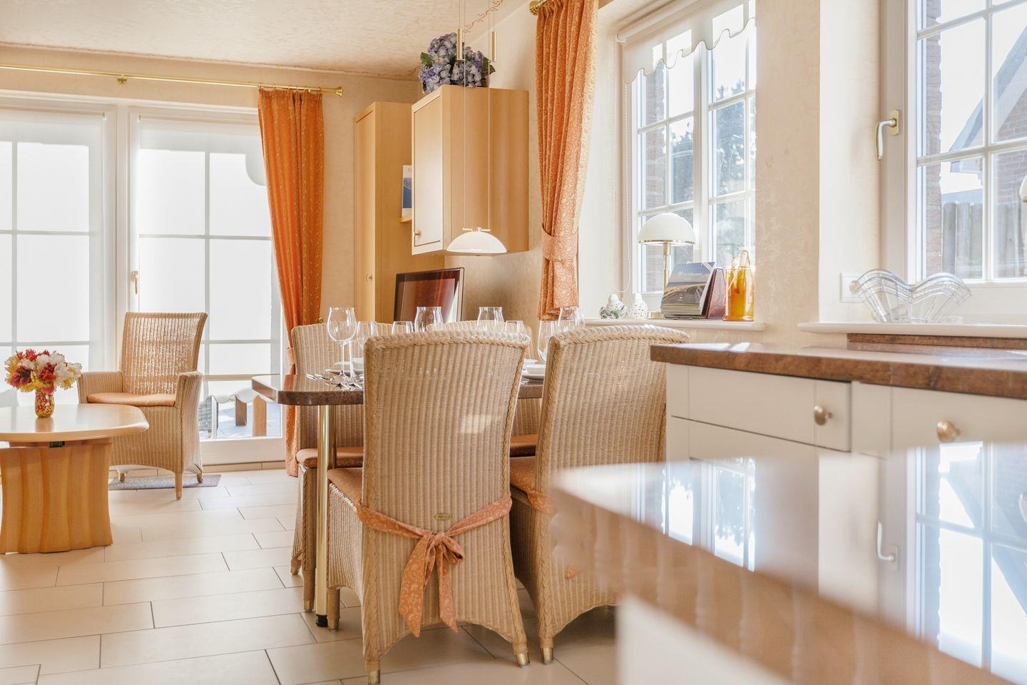 EG: Wohn-/Essbereich mit Flatscreen-TV, CD-Player, Radio und WLAN, integrierte Küche mit Backofen, Geschirrspülmaschine, Wasserkocher und Kaffeemaschine, kleines Gäste-WC, sonnige Süd-Terrasse mit Gartenmöbeln und Strandkorb (möbliert ca. von April-Oktober)