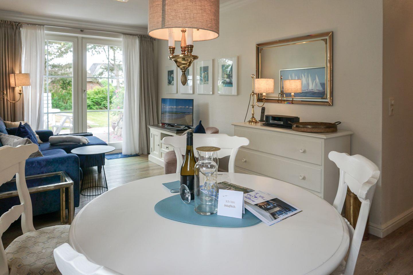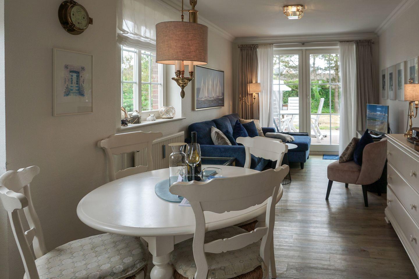 Der gemütliche Wohnraum des Domizils bietet Ihnen eine gemütliche Couchecke, einen Essbereich für bis zu vier Personen. Die Küche finden Sie separat, aber direkt angeschlossen an den Essbereich. Vom Wohnbereich aus betreten Sie Ihre wunderschöne, möblierte Süd-Terrasse mit Blick in den idyllischen Garten. Die Sonne können Sie hier bis in die Abendstunden ausgiebig genießen.