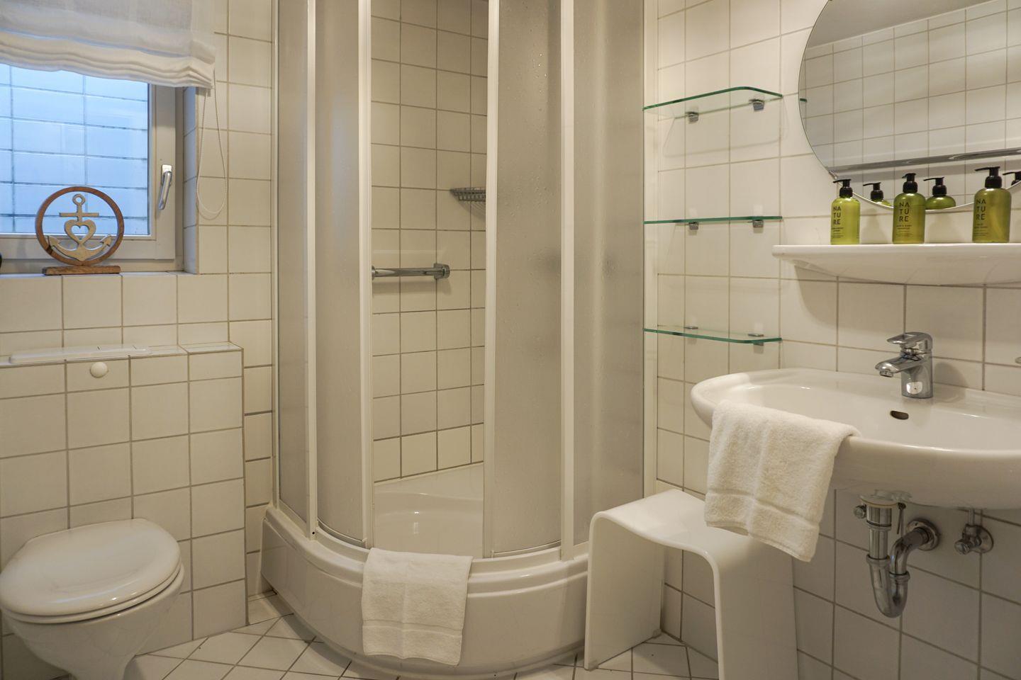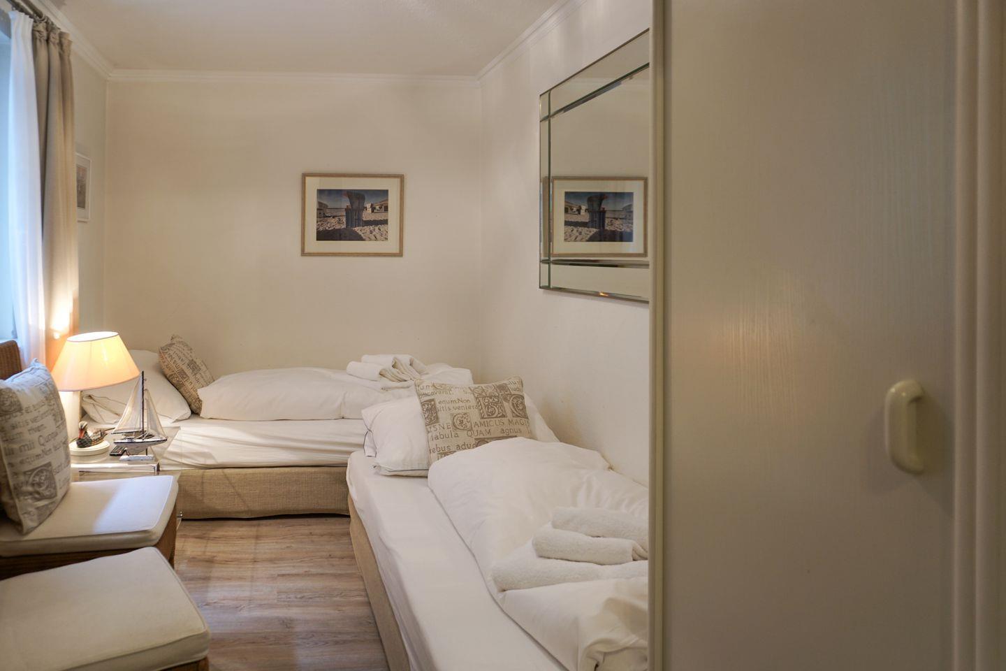 Im Souterrainbereich der Wohnung erwarten Sie zwei weitere Räume, wobei ein Raum Ihnen ein Doppelbett und Flatscreen-TV, der kleinere Raum zwei Einzelbetten zur Verfügung stellt. Auf gleicher Ebene befindet sich ein Badezimmer mit Dusche und WC sowie ein kleines, separates Gäste-WC.