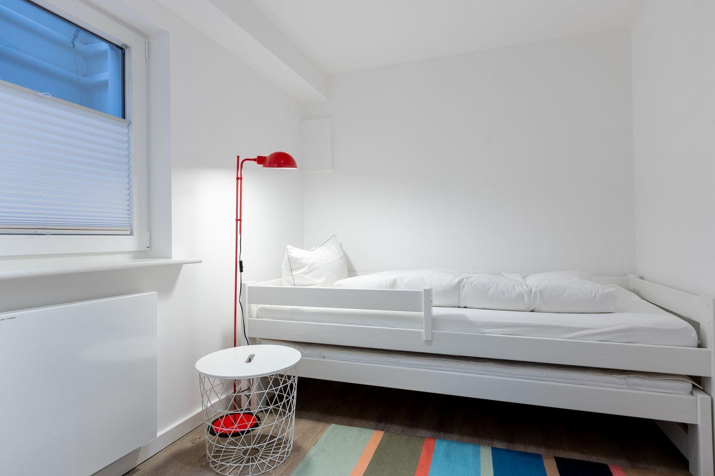 Im Souterrainbereich der Wohnung erwarten Sie zwei schön gestaltete Räume, wobei ein Raum Ihnen ein Doppelbett mit Smart-TV mit Netflix inklusive, der kleinere Raum zwei Einzelbetten zur Verfügung stellt. Es handelt sich hier um ein Tageslichtschlafzimmer mit Fensteraushub. Auf gleicher Ebene befindet sich ein Badezimmer mit Dusche, das WC befindet sich auf gleicher Ebene in einem separaten Raum.