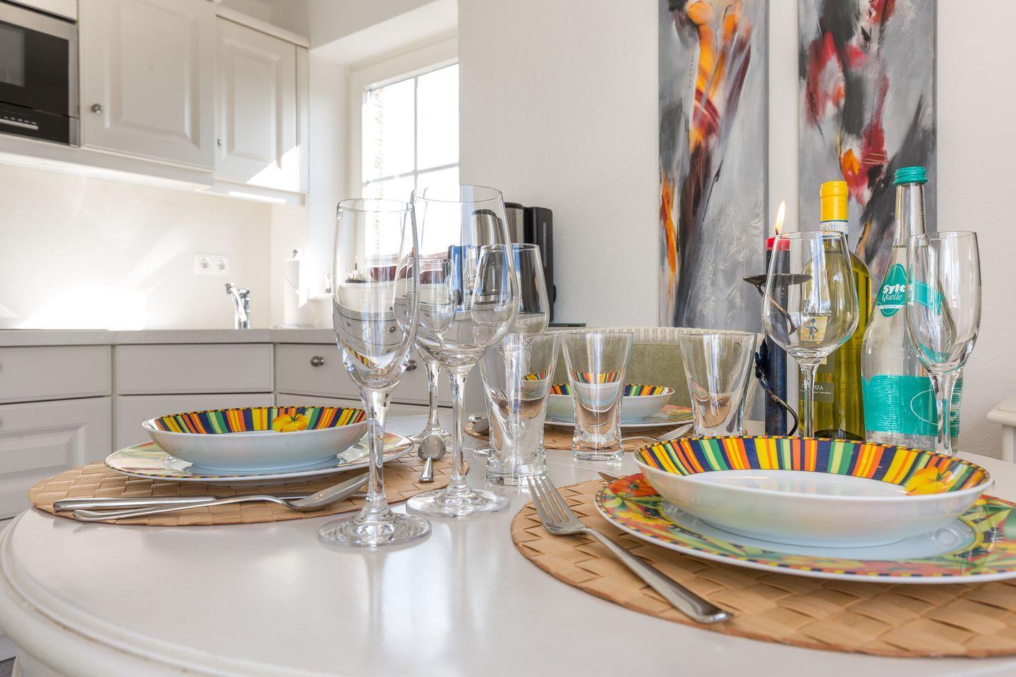 OG: Wohn-/Essbereich mit Flatscreen-TV, CD-Player, DVD-Player, Telefonflatrate ins deutsche Festnetz, Stereoanlage, Radio und WLAN, integrierte Küche mit Mikrowellen-Backofen Kombination, Geschirrspülmaschine, Wasserkocher und Kaffeemaschine, sonniger Süd-Balkon mit Gartenmöbeln (möbliert ca. von April-Oktober), Badezimmer mit Dusche und WC