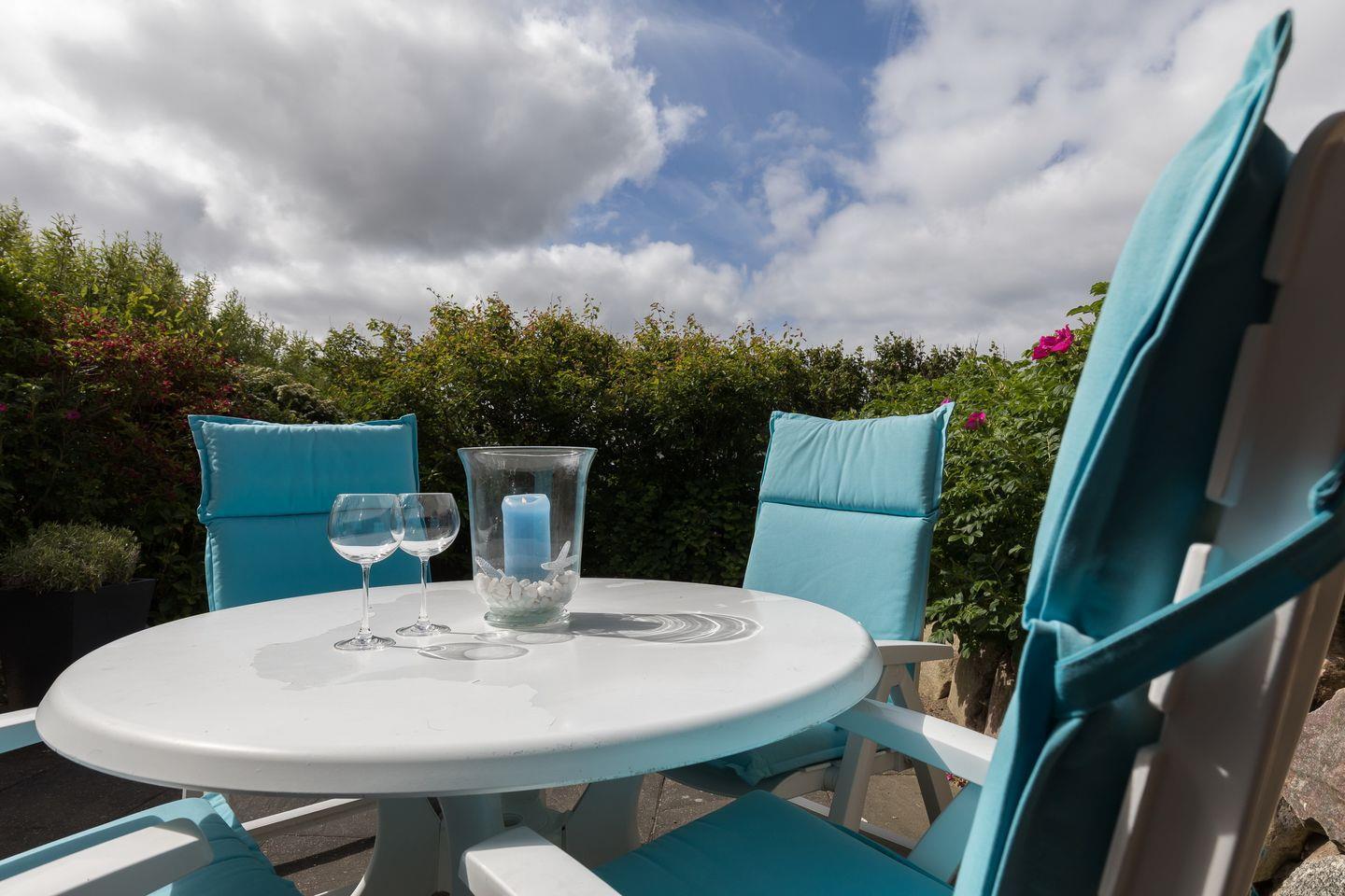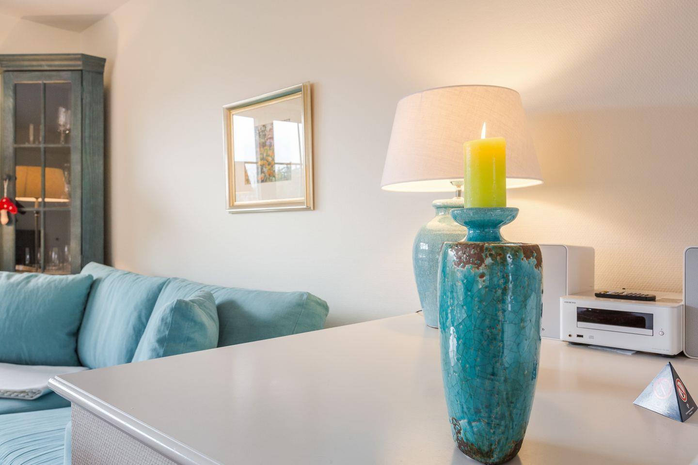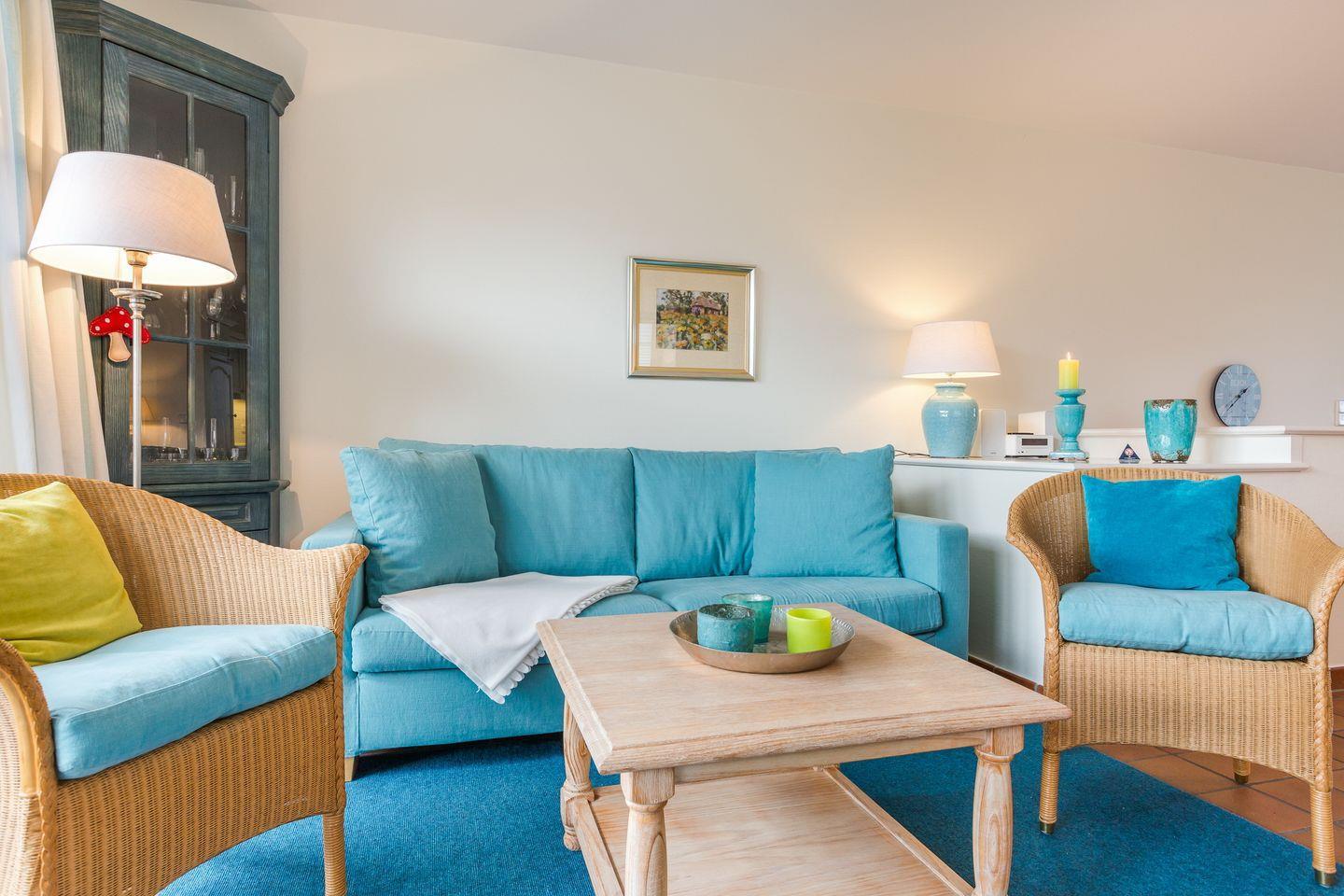 EG: Heller und sehr geschmackvoll eingerichteter Wohnraum mit Kabel-TV, Mini-Hifi Anlage und Telefon. Integrierte Küche mit Backofen und Geschirrspüler. Gäste-WC. Sehr schöne Süd-Terrasse mit Gartenmöbeln und Strandkorb (ca. von April-Oktober).