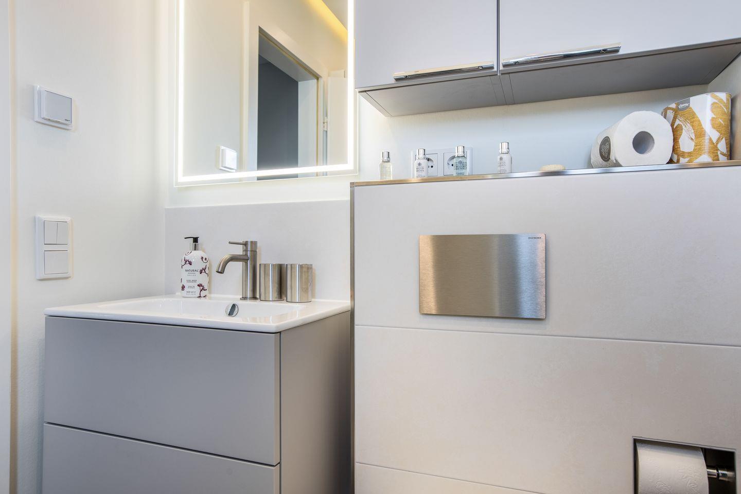 ausgestatten Küchenzeile sowie einer kleinen Essecke. Das daran angrenzende Badezimmer ist komplett hell gehalten.