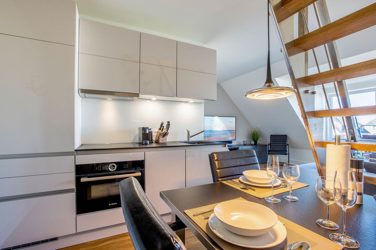 OG: Wohnraum mit Flatscreen-TV und Heos-Soundsystem; Balkon mit Balkonmöbeln; offene Küche mit