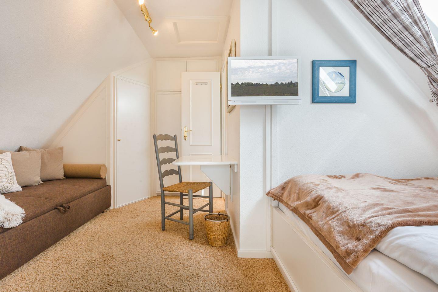 1 Raum mit franz. Bett (140 x 200 cm), 1 Schlafsofa, TV, Dusche/WC, Föhn.