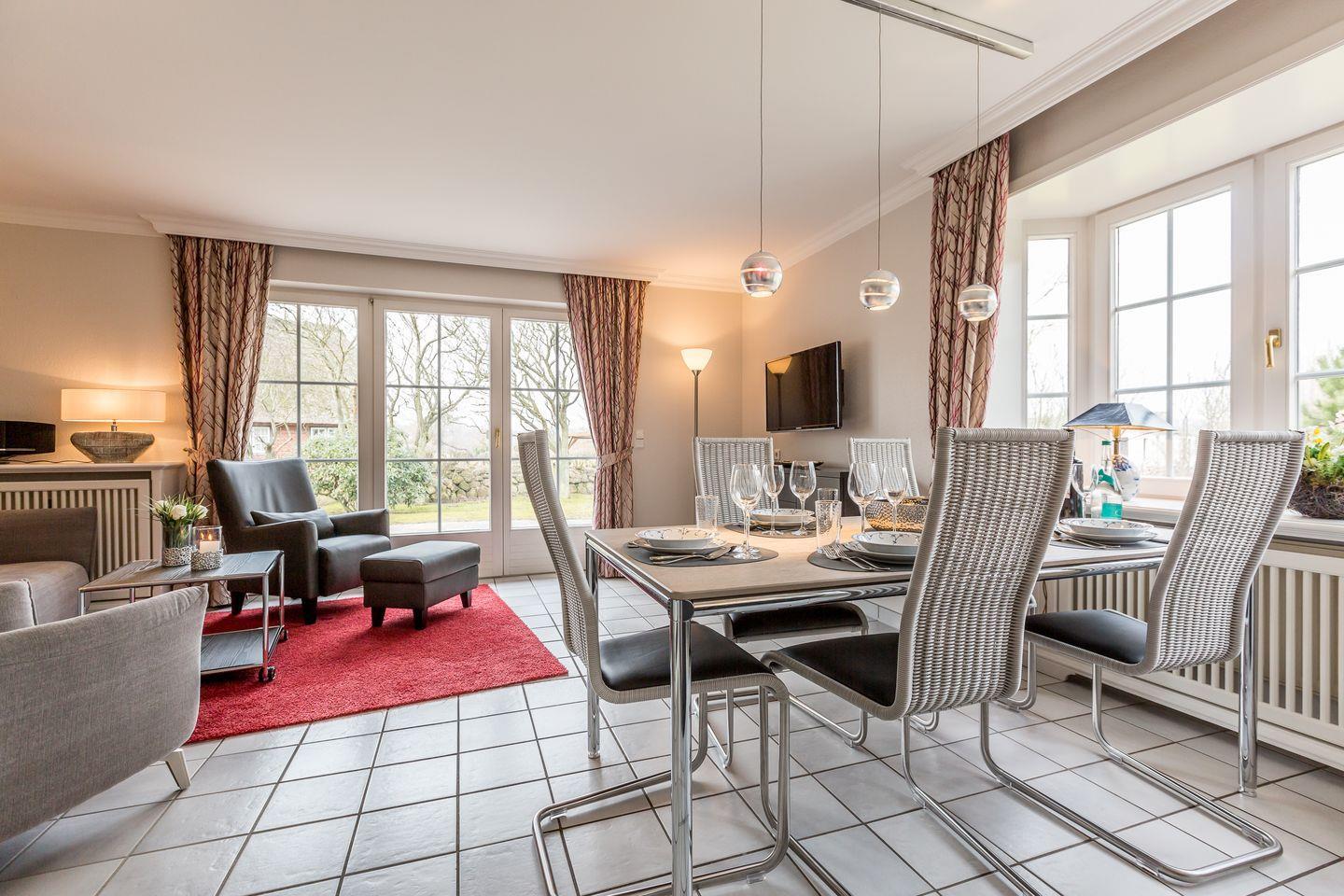 Dieses Appartement im Enen-Neest ist ein wahr gewordener Ferientraum auf 85 m². Die Wohnung ist lichtdurchflutet und modern eingerichtet. Vom großzügigen Wohnbereich aus erreichen Sie Ihre möblierte Wohlfühlterrasse mit Blick in den großen Garten, auf der Sie die Sylter Sonnentage genießen können.