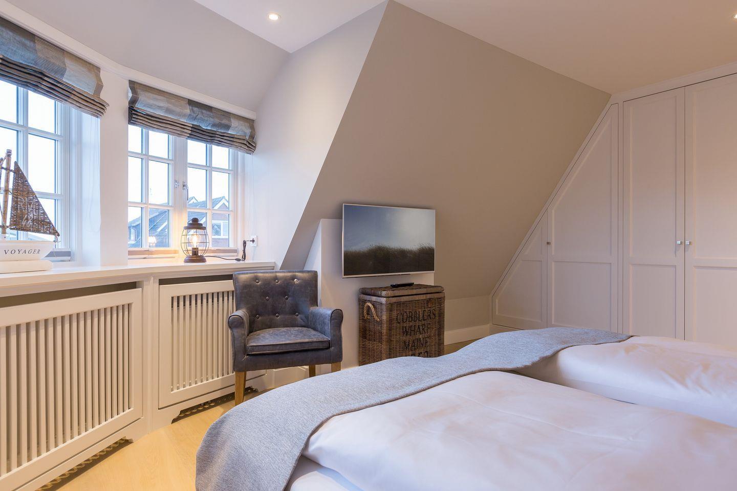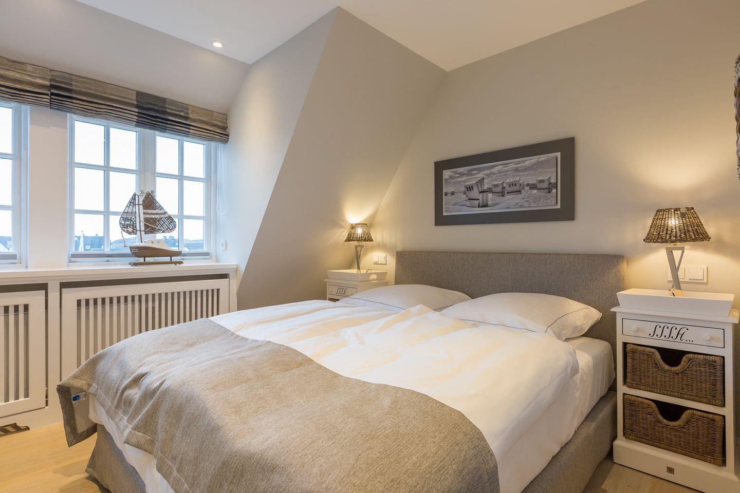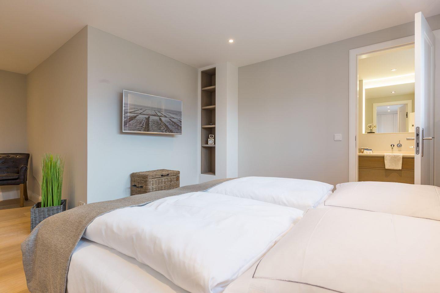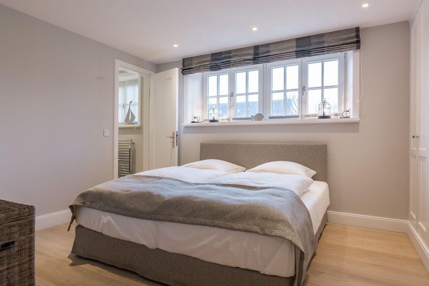 Im Obergeschoss befinden sich zwei Schlafzimmer mit Boxspring-Doppelbetten und jeweils einem Bad en Suite. Vom Obergeschoss aus haben Sie einen einmaligen Blick auf die Nordsee und das Treiben auf der Promenade in Wenningstedt.