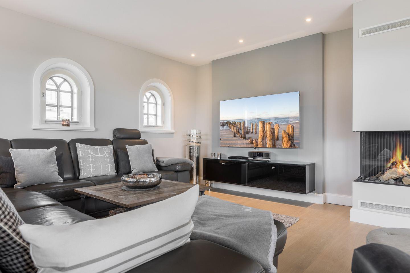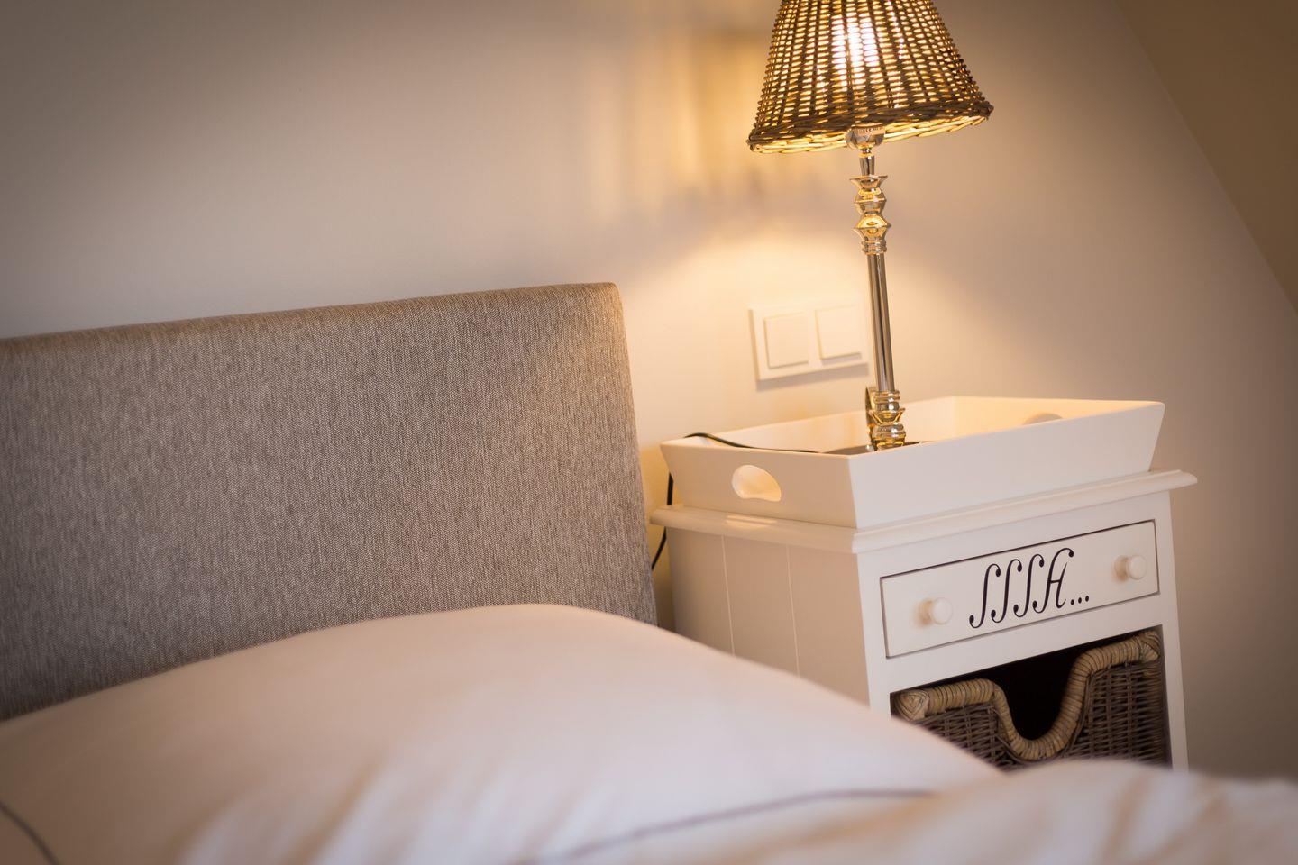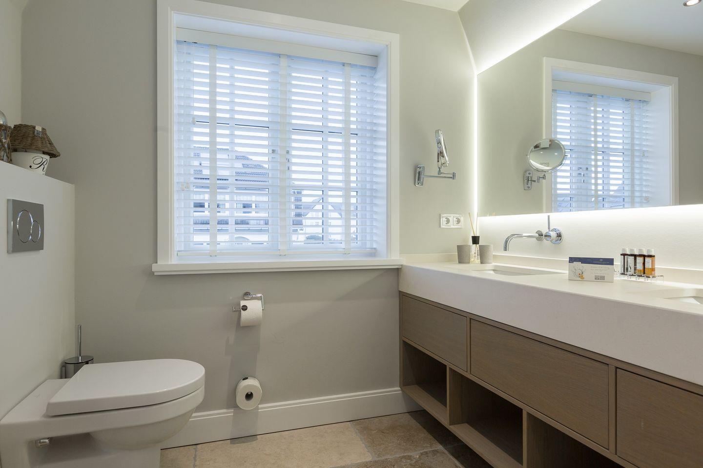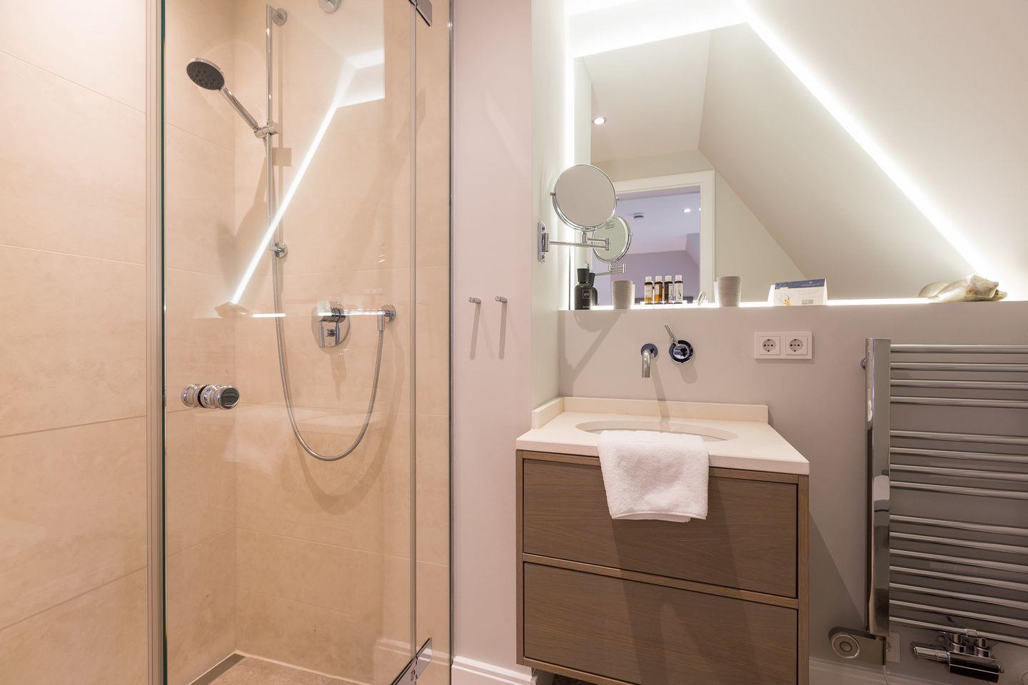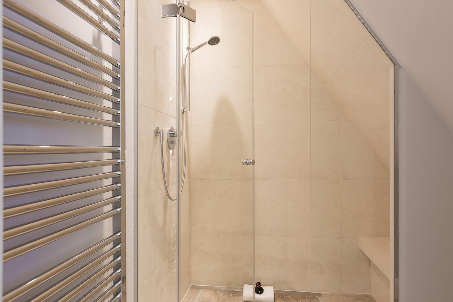 Im Obergeschoss befinden sich zwei Schlafzimmer mit Boxspring-Doppelbetten und jeweils einem Bad en Suite. Vom Obergeschoss aus haben Sie einen einmaligen Blick auf die Nordsee und das Treiben auf der Promenade in Wenningstedt.