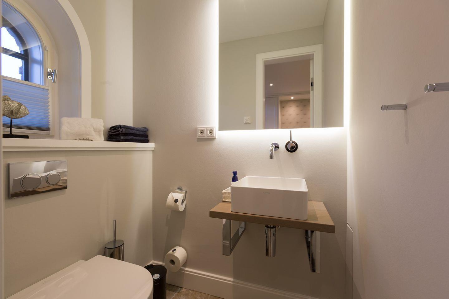 Gäste-WC im EG, Süd-Westterrasse mit Gartenmöbeln aus Polyrattan und Strandkorb (ca. Apr - Okt.)