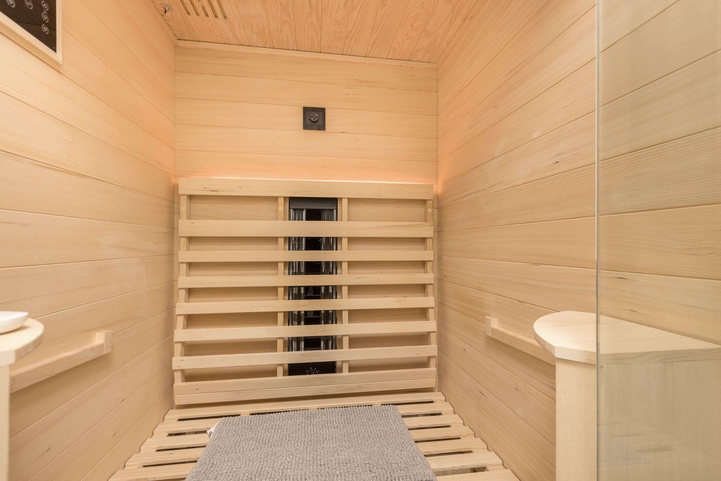 Auf gleicher Ebene bietet Ihnen die Wohnung ein Gäste-WC sowie einen Schlafraum mit Doppelbett. Das Untergeschoss des Domizils verfügt über einen weiteren Raum mit Doppelbett und Flatsceen-TV. Hier erwartet Sie außerdem ein geräumiges Badezimmer mit Dusche, WC und einer Sanatherm Infrarotkabine.