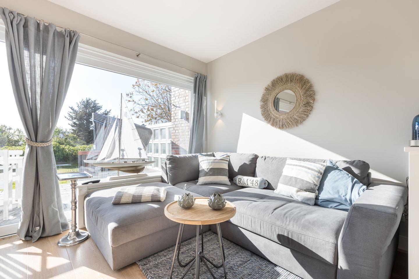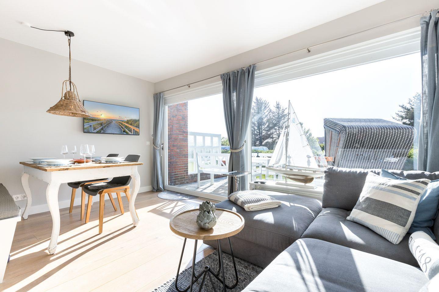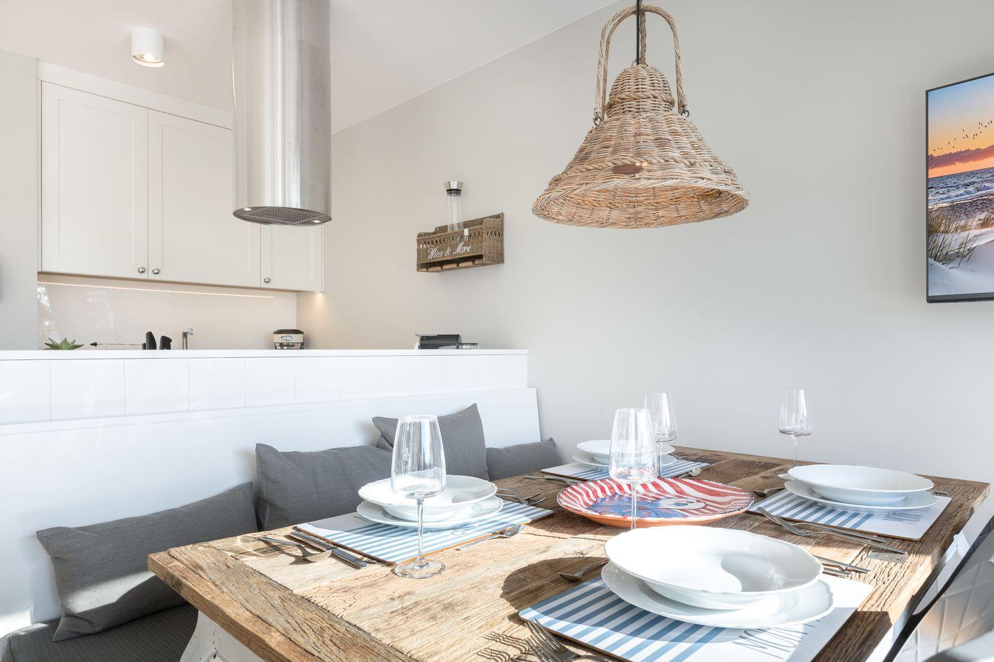 Der Wohnraum des Domizils ist geschmackvoll und maritim eingerichtet. Eine große Fensterfront sorgt für jede Menge Tageslicht und der Essbereich lädt dazu ein, sich hier beim Urlaubsfrühstück so richtig Zeit zu lassen. Die offene Küche ist sehr gut ausgestattet und verfügt unter anderem über einen Backofen, Induktionsherd und Geschirrspülmaschine. Von hier aus erreichen Sie auch Ihre großzügige Terrasse, die von April bis Oktober möbliert ist.