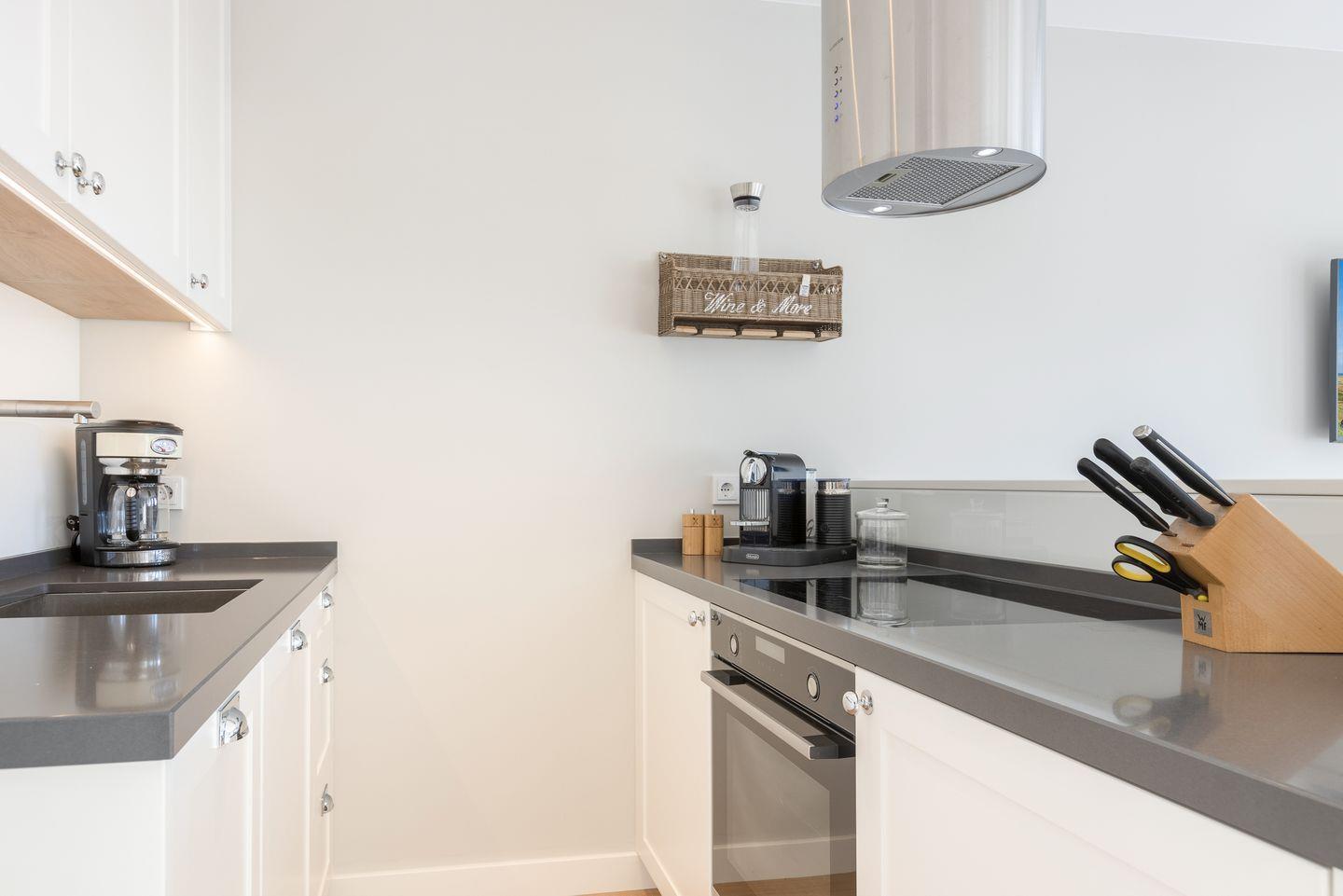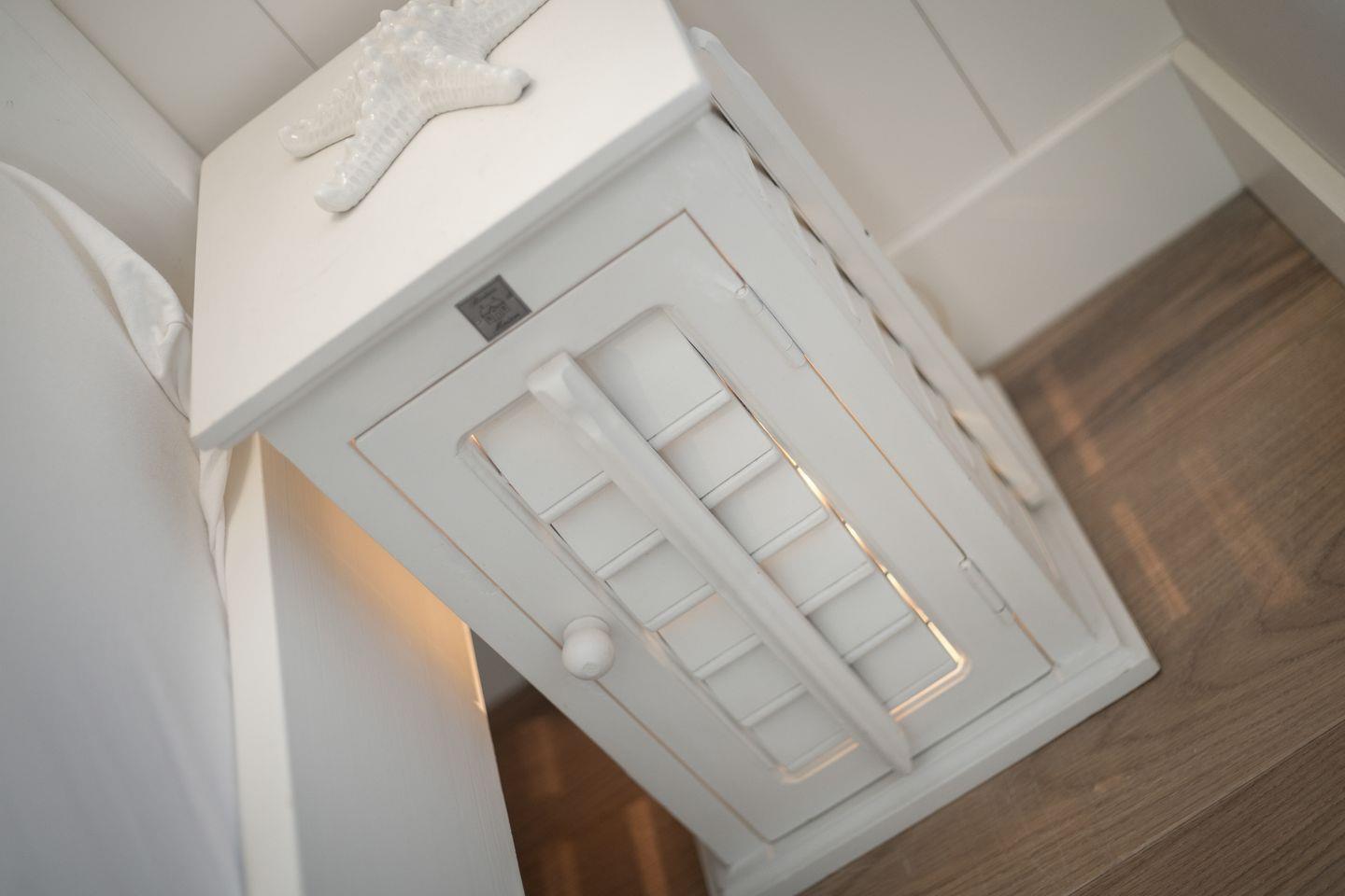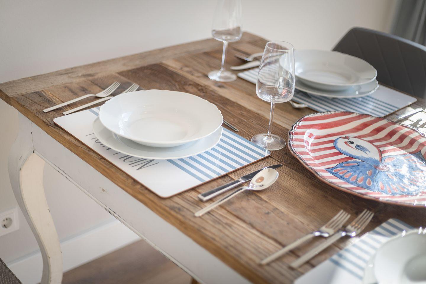 Der Wohnraum des Domizils ist geschmackvoll und maritim eingerichtet. Eine große Fensterfront sorgt für jede Menge Tageslicht und der Essbereich lädt dazu ein, sich hier beim Urlaubsfrühstück so richtig Zeit zu lassen. Die offene Küche ist sehr gut ausgestattet und verfügt unter anderem über einen Backofen, Induktionsherd und Geschirrspülmaschine. Von hier aus erreichen Sie auch Ihre großzügige Terrasse, die von April bis Oktober möbliert ist.