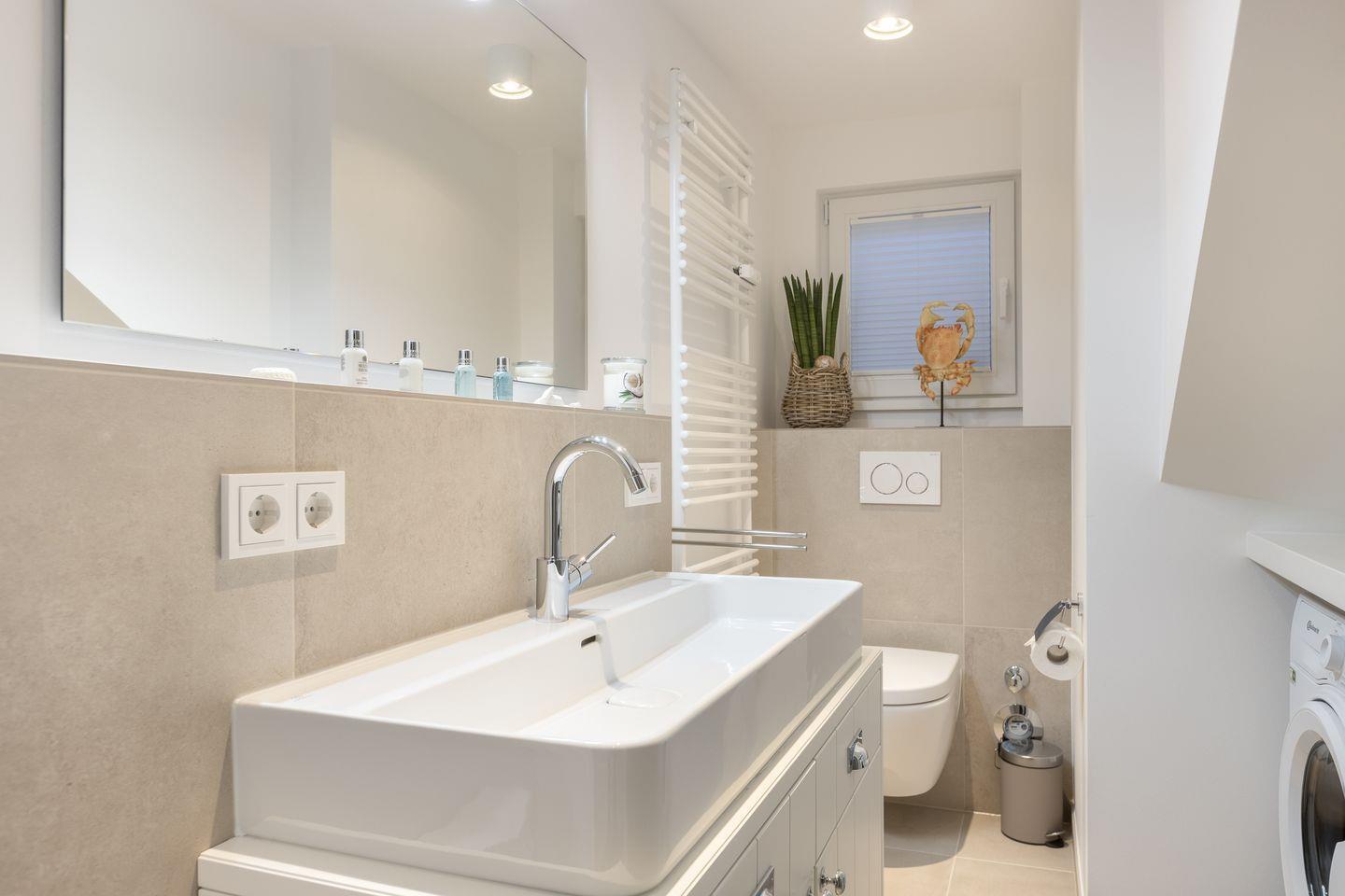 EG: Wohnraum mit Flatscreen-TV, W-LAN, Essbereich, offene Küche mit Backofen, Induktionsherd, Geschirrspülmaschine, Nespressomaschine, Terrasse mit Gartenmöbeln und Strandkorb (April-Oktober), Gäste-WC, ein Schlafzimmer mit Doppelbett (180x200cm)