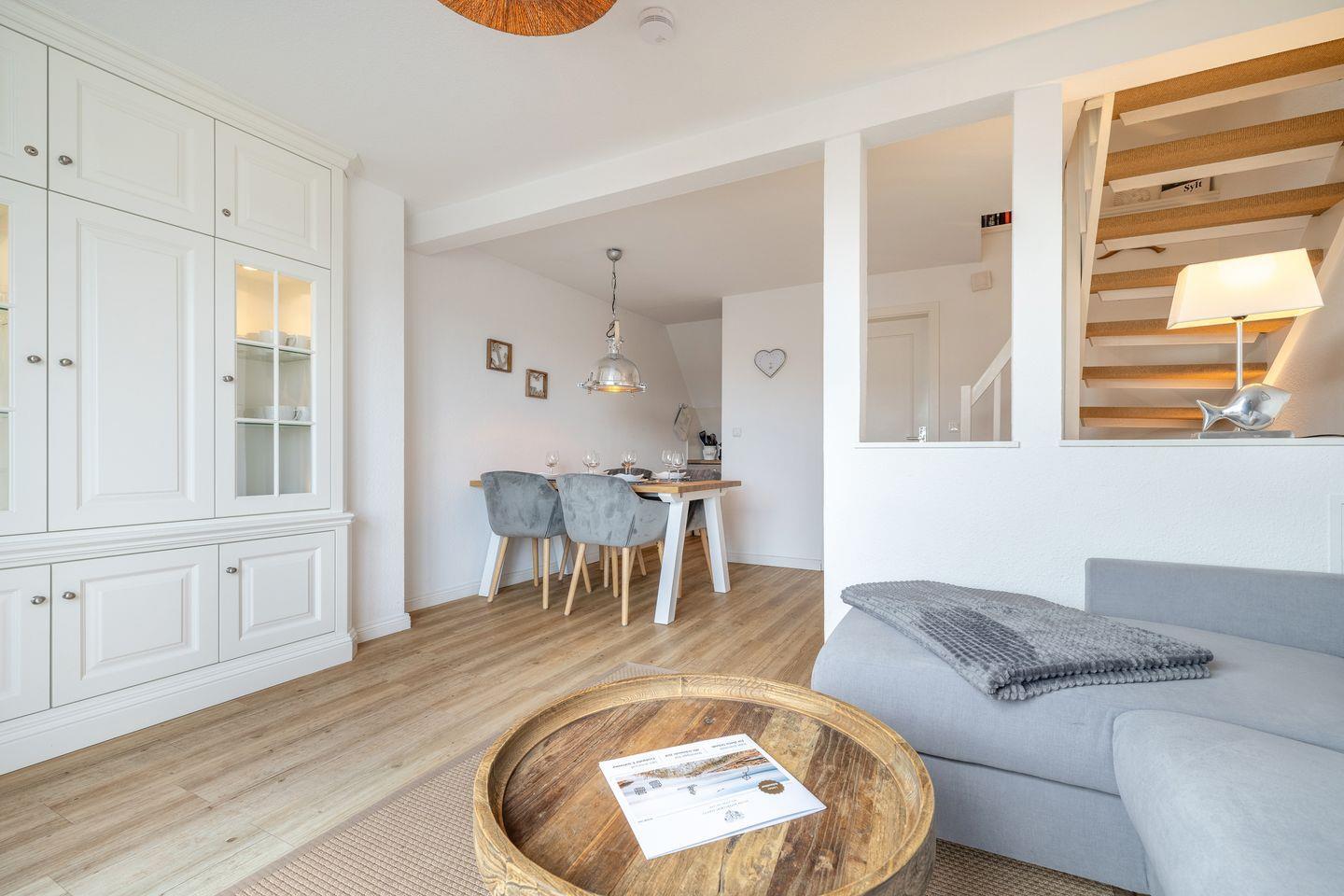 OG: Wohnzimmer mit TV, Esstisch und Schlafsofa (140x200cm), Küchenzeile mit Induktionskochfeld, Mikrowelle mit Grillfunktion, Geschirrspül- und Nespressomaschine. Der Balkon ist Richtung Süden ausgerichtet.